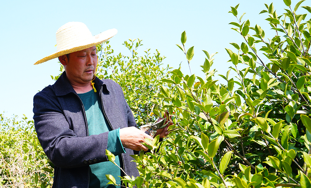 在村道一旁的油茶林內(nèi),蔣畈社區(qū)村民彭平手持剪刀,穿梭在茶林中,時(shí)而彎腰,時(shí)而踮腳,熟練地為油茶樹(shù)修剪枝葉。“油茶是香餑餑,不愁銷路,果實(shí)成熟后直接賣給鎮(zhèn)上的茶油加工廠就行了?!彼麡?lè)呵呵地說(shuō)道,自己擁有50畝的油茶基地,每年可增收5萬(wàn)元。介于當(dāng)前形勢(shì)良好,他今年又投入了2萬(wàn)元新開(kāi)發(fā)了15畝油茶林。