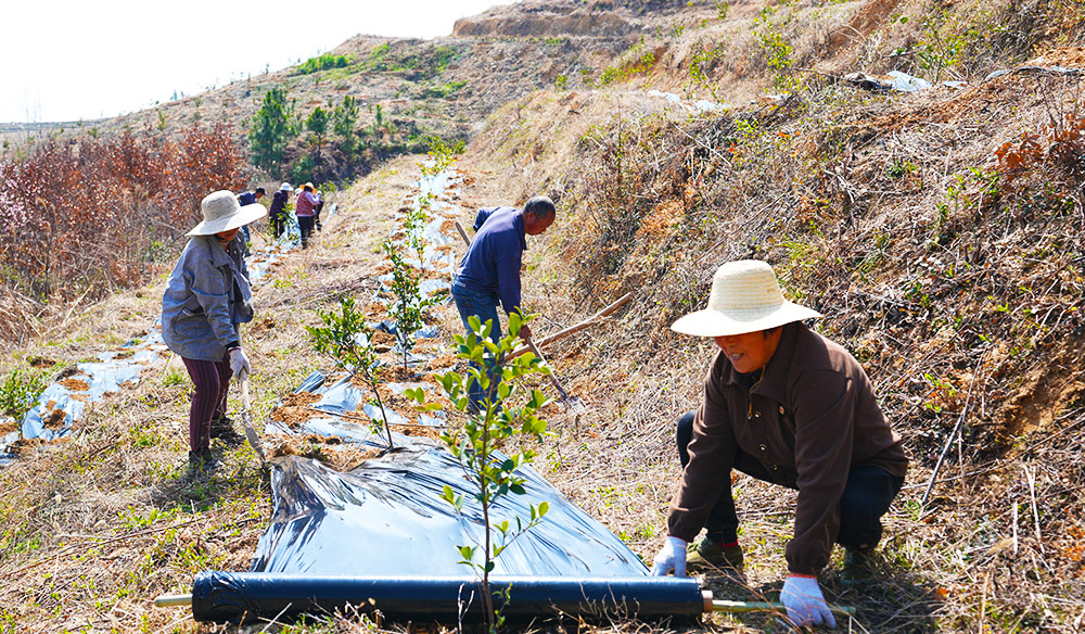 3月21日,春暖花開(kāi),陽(yáng)光明媚。三陽(yáng)鎮(zhèn)光武嶺村長(zhǎng)嶺油茶基地內(nèi)呈現(xiàn)出一派生機(jī)勃勃、熱火朝天的景象。數(shù)十名村民正揮鍬鏟土、澆水灌溉、施肥除草,分工協(xié)作,對(duì)油茶種苗覆膜,搶抓晴好天氣開(kāi)展油茶種植工作。