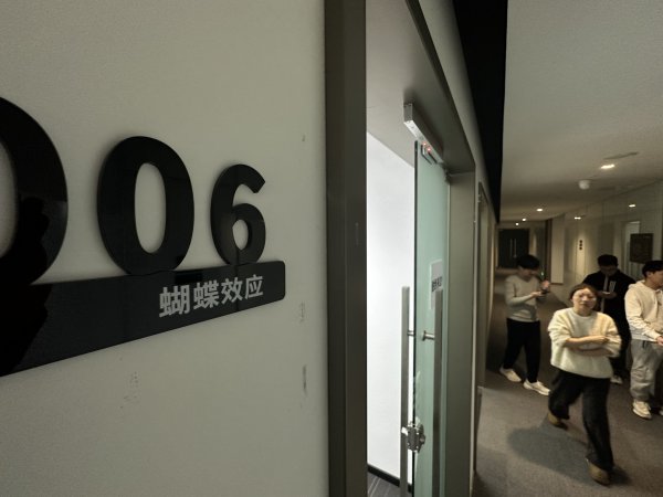 3月6日晚9時,研發(fā)Manus的蝴蝶效應(yīng)武漢公司大門前,不少來訪者咨詢合作事宜。 陳卓 攝