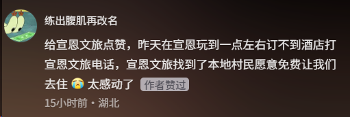 5月2日,王女士一家在湖北旅游時遇到住宿難題,連續(xù)詢問十余家酒店民宿均無果,情急之下?lián)芡水?dāng)?shù)匚穆镁值闹蛋嚯娫?。令人感動的是,宣恩縣文旅局局長當(dāng)即決定——讓出自家的客房免費提供給王女士一家居住。
