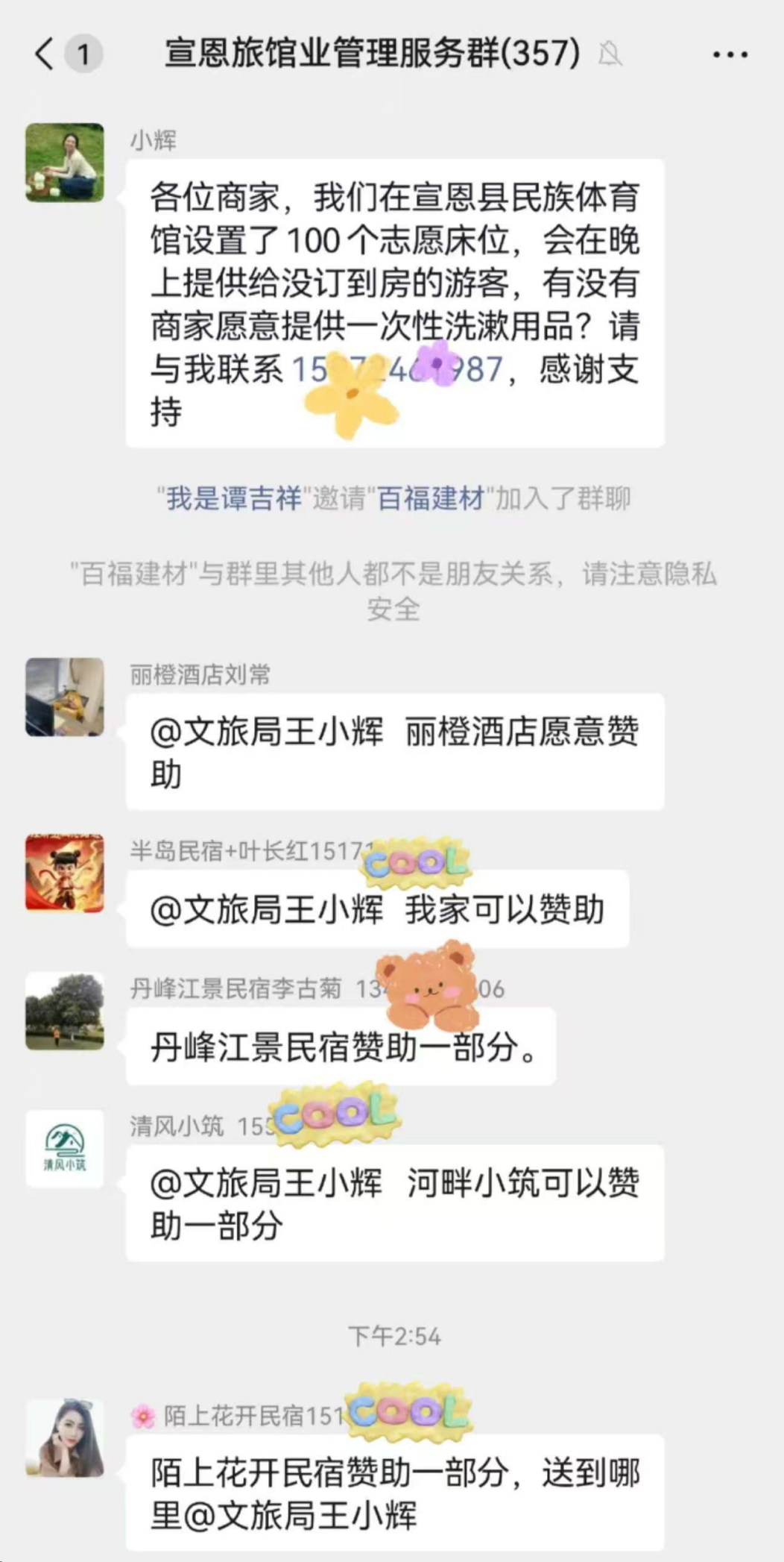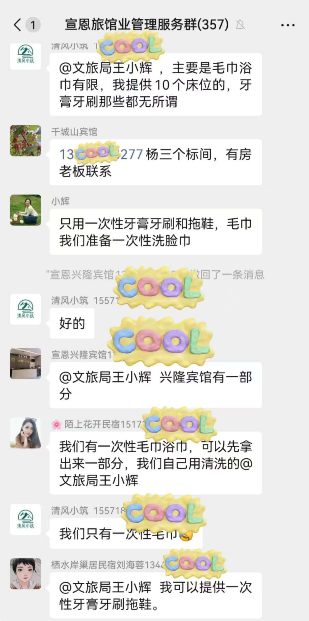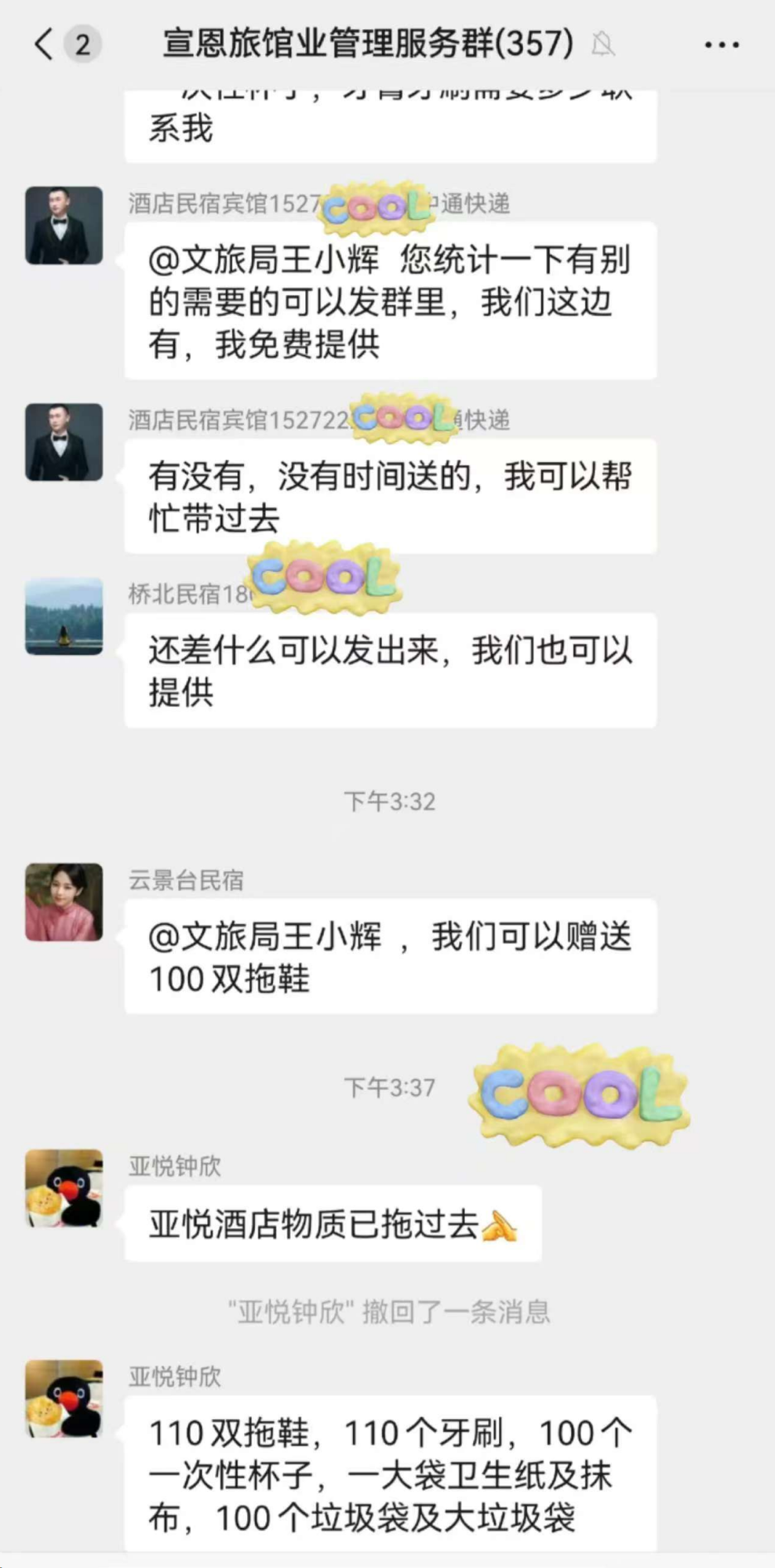 俗話說,人多力量大。面對游客的應(yīng)急需求,宣恩文旅局決定發(fā)動社會力量。5月3日上午,文旅局工作人員王小輝在當(dāng)?shù)芈糜谓涣魅喊l(fā)出物資征集信息后,立即獲得熱烈響應(yīng)——“我家可以贊助”“麗橙酒店愿意贊助”“我可以提供一次性牙膏牙刷拖鞋”“我們有一次性毛巾浴巾,可以先拿出來一部分”……
