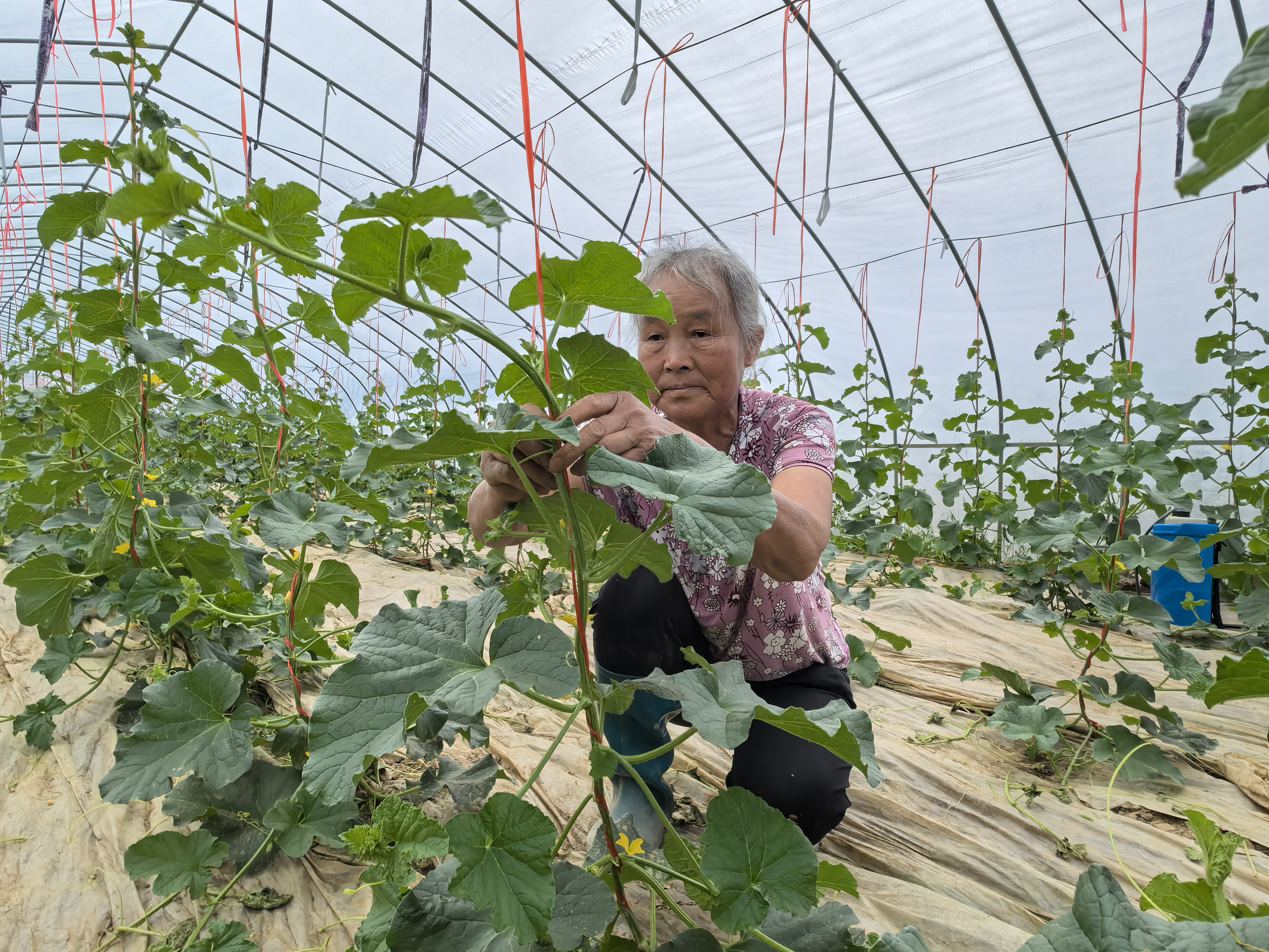 在香瓜地里,68歲的村民潘金英老人正麻利地掐去多余的瓜絲,引導(dǎo)瓜藤爬上一條條垂帶。