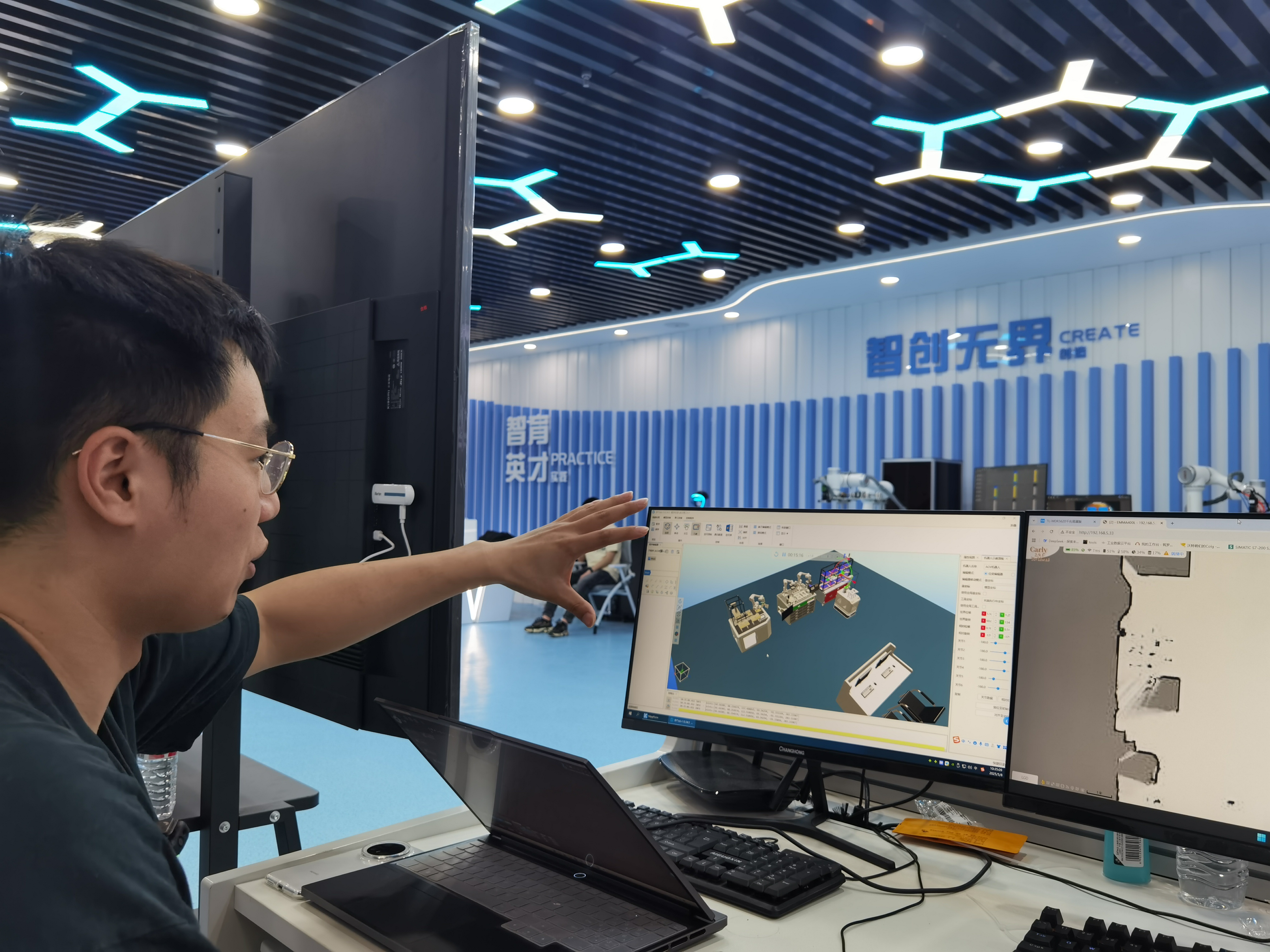 學(xué)生在未來學(xué)習(xí)中心通過數(shù)字孿生系統(tǒng)操控機(jī)器人制造電池。