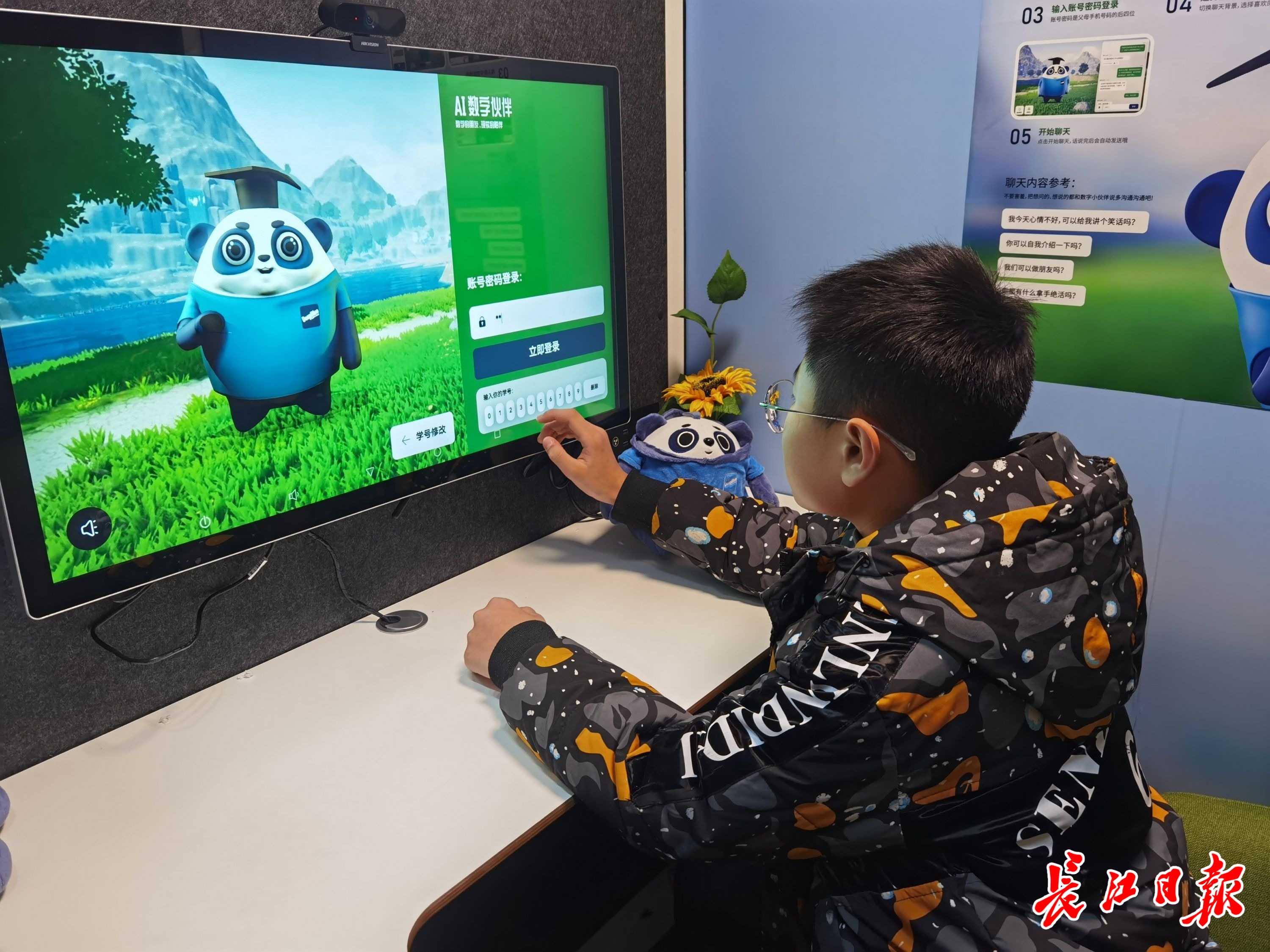 一款名為“AI數(shù)字伙伴”的機器人落地武漢萬松園路小學(xué)并使用,學(xué)生正在與“AI數(shù)字伙伴”“蘭博”對話。記者楊佳峰 攝