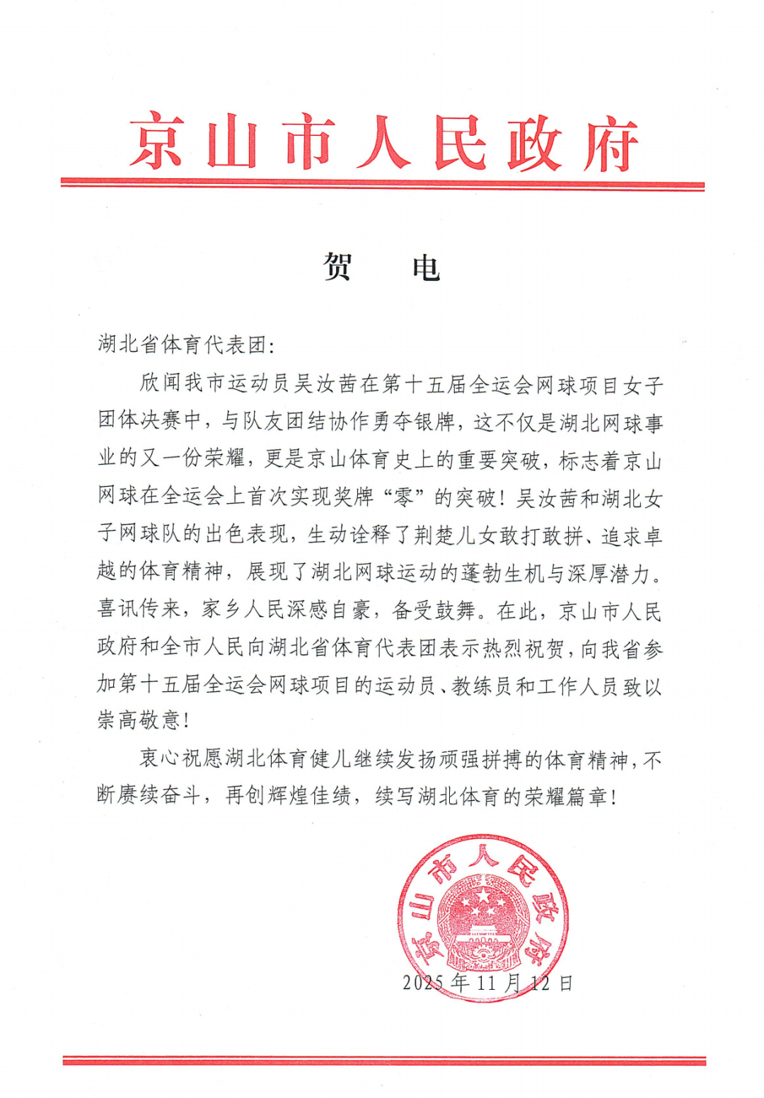 中共京山市委、京山市人民政府在賀電中表示,吳汝茜和湖北女子網(wǎng)球隊的出色表現(xiàn),“標(biāo)志著京山網(wǎng)球在全運(yùn)會上首次實現(xiàn)獎牌‘零’的突破”,并寄語她繼續(xù)發(fā)揚(yáng)拼搏精神,續(xù)寫湖北網(wǎng)球的榮耀篇章。