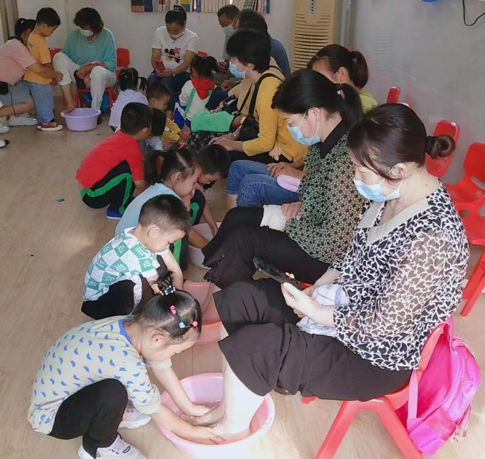(孩子們給爺爺奶奶洗腳)9月29日,在重陽節(jié)來臨之際,永興幼兒園開展“重陽秋色暖,祖孫情誼濃”重陽節(jié)感恩主題活動,讓幼兒們傳承尊老、敬老、愛老這一傳統(tǒng)美德?;顒又?,孩子們?yōu)闋敔斈棠汤收b了童謠《中華孝道