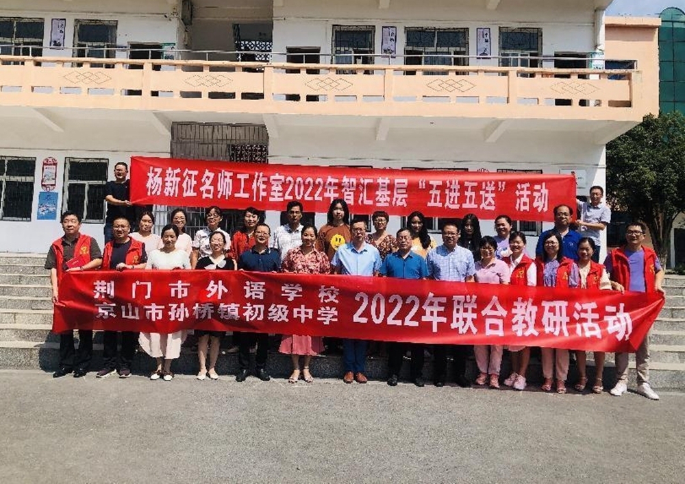 結(jié)對師徒及相關(guān)領(lǐng)導合影留念9月16日,荊門市百名名優(yōu)教師智匯基層“五進五送”系列活動啟動儀式在京山市孫橋鎮(zhèn)初級中學舉行。儀式上,來自荊門市外語學校的四名名優(yōu)教師與孫橋鎮(zhèn)初級中學的八名青年教師進行了師徒