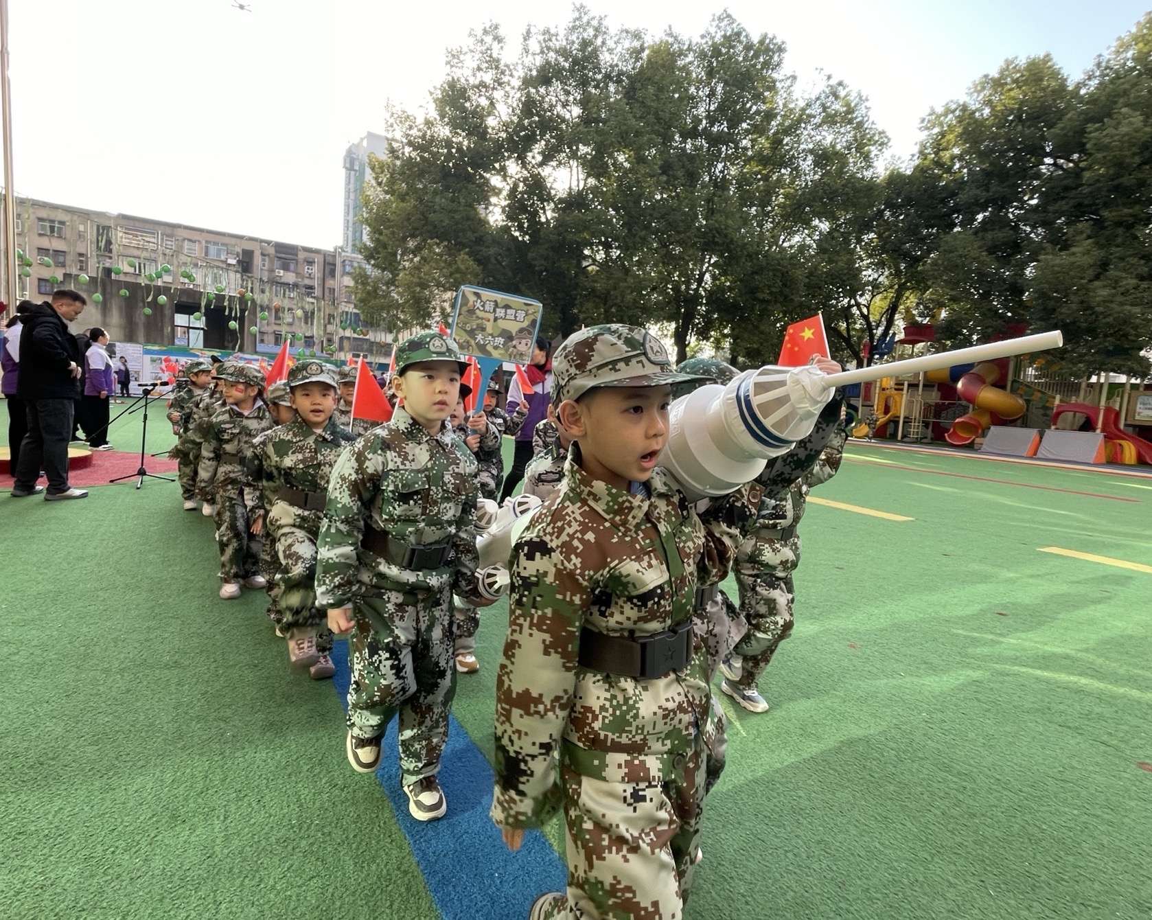 總園和三角洲園區(qū)以“紅星閃耀,童心筑夢(mèng)——重走長(zhǎng)征路”為主題,打造沉浸式紅色運(yùn)動(dòng)課堂。萌娃們化身“海、陸、空”三軍小戰(zhàn)士精彩亮相,用整齊的步伐和響亮的口號(hào),展現(xiàn)出新時(shí)代兒童朝氣蓬勃的精神風(fēng)貌。在“巧渡金沙江”“飛奪瀘定橋”“穿越封鎖線”等主題關(guān)卡中,小戰(zhàn)士們不畏艱難險(xiǎn)阻,勇往直前。親子攜手突破挑戰(zhàn),感受長(zhǎng)征精神,讓紅色基因在運(yùn)動(dòng)中薪火相傳。