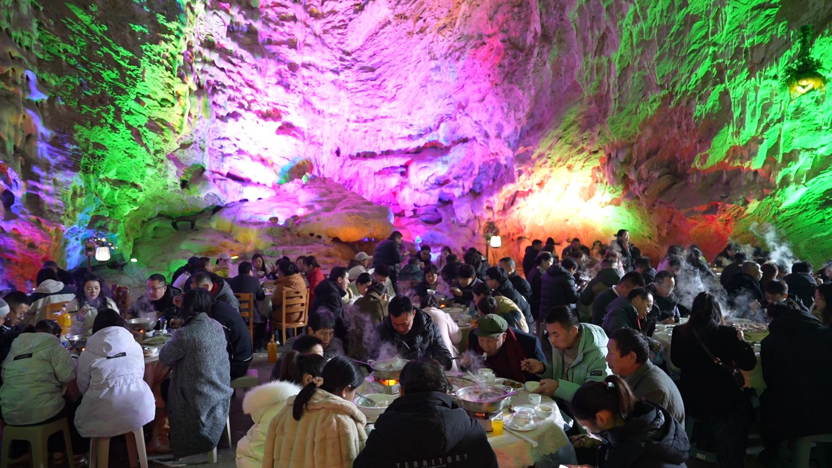 “這是我第一次在這樣的溶洞里面吃這樣的農(nóng)家菜,大家來自五湖四海,感覺很熱鬧,很親切,這個(gè)體驗(yàn)很好?!庇慰驮恳操澆唤^口。