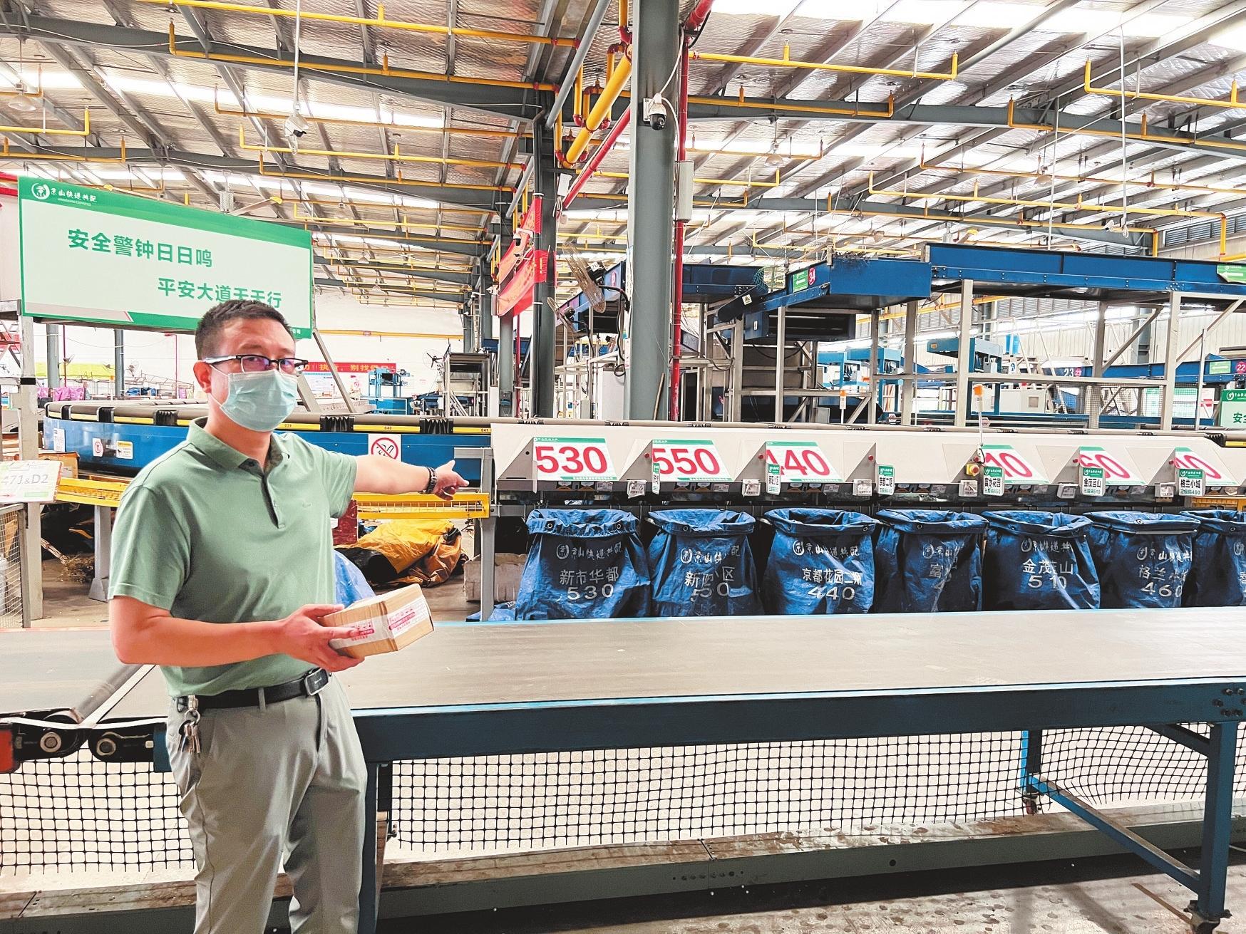 金瑞物流產(chǎn)業(yè)園內(nèi),京山溪鳥供應鏈管理有限公司負責人周平向記者介紹全自動分揀線?! ∥?圖 湖北日報全媒記者 童晨曦 祝華 通訊員 余舟 潘晶 9月1日11時許,京山市金瑞物流產(chǎn)業(yè)園內(nèi),快遞車輛進進出