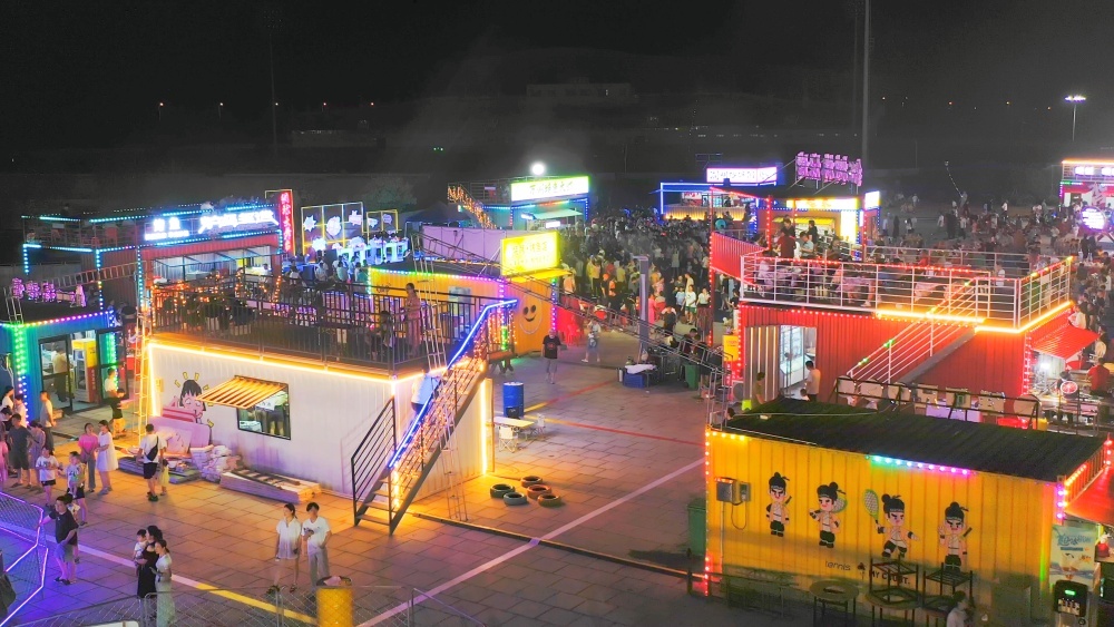 今年6月,獨(dú)具特色的集裝箱集市驚艷亮相,順利開(kāi)街。夜幕降臨后,在霓虹燈照射下,17個(gè)集裝箱顏色鮮艷,錯(cuò)落擺放,設(shè)計(jì)感十足,該集市由美食區(qū)、休閑街區(qū)、公益地?cái)倕^(qū)、游樂(lè)區(qū)等4個(gè)區(qū)域和網(wǎng)球大舞臺(tái)組成,共有15家餐飲店、9個(gè)游樂(lè)項(xiàng)目和145個(gè)攤位??旧?、芝士玉米、手工檸檬茶等美食飲品應(yīng)有盡有,旋轉(zhuǎn)木馬、碰碰車等項(xiàng)目吸引兒童爭(zhēng)相體驗(yàn),網(wǎng)球大舞臺(tái)為市民提供才藝展示的平臺(tái)。