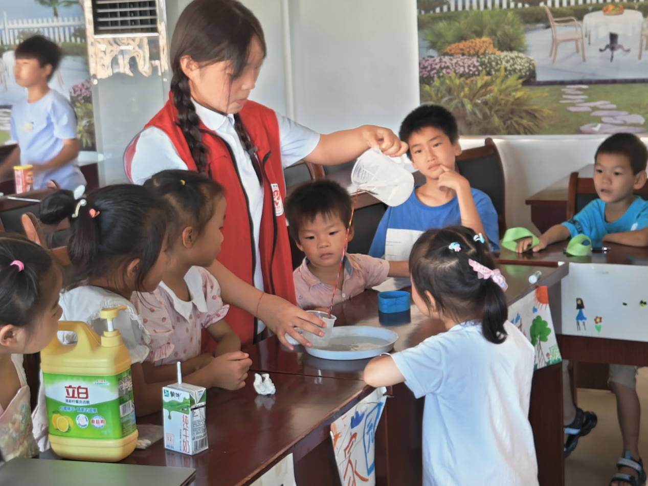 近日,曹武鎮(zhèn)社工站在源泉鎮(zhèn)村開(kāi)展了“小小科學(xué)家、點(diǎn)亮大夢(mèng)想”科學(xué)實(shí)驗(yàn)主題活動(dòng)?;顒?dòng)中,社工先將普通的紙片小魚(yú)和尾部涂了洗潔精的紙片小魚(yú)先后放入水中,引導(dǎo)兒童觀察前后變化,引入水的表面張力的實(shí)驗(yàn)原理;隨