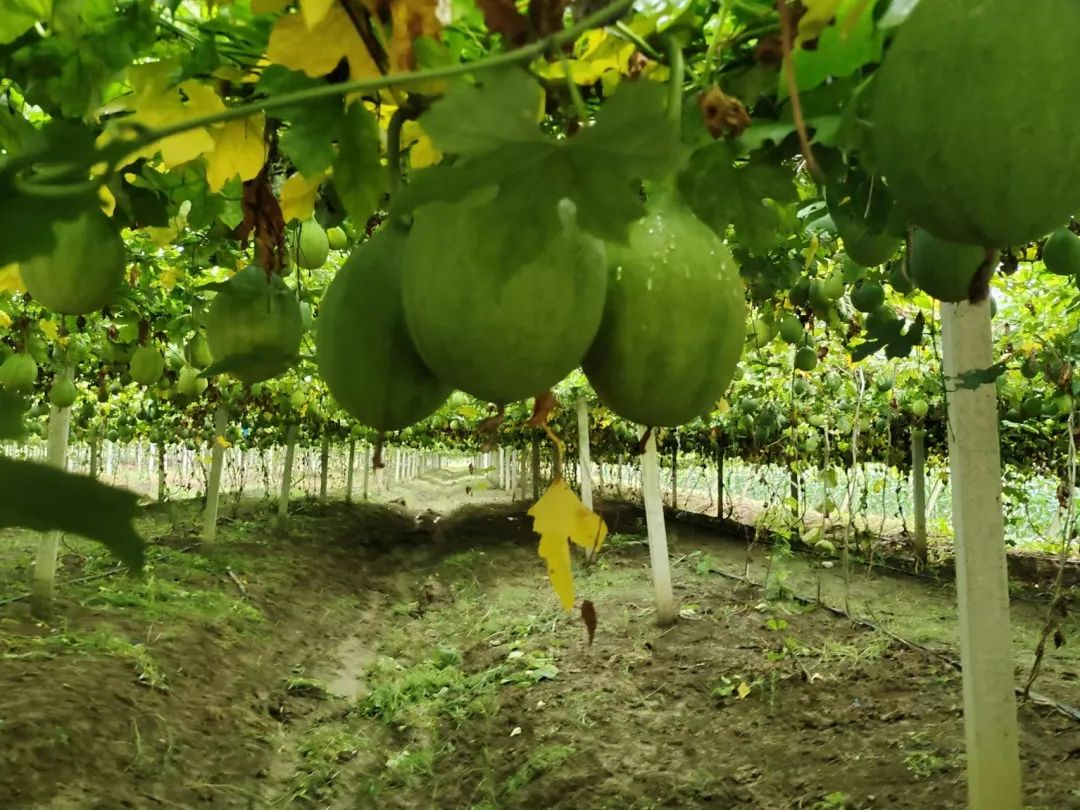 (掛滿(mǎn)藤蔓的瓜蔞)近日,筆者在曹武鎮(zhèn)石橋村瓜蔞種植基地,一個(gè)個(gè)青綠色的瓜蔞掛在藤蔓上,煥發(fā)出勃勃生機(jī)。基地負(fù)責(zé)人鄒斌正帶領(lǐng)工人在瓜架下來(lái)回穿梭,忙著除草、剪枝、施肥,為豐收打下基礎(chǔ)。今年是石橋村種植瓜