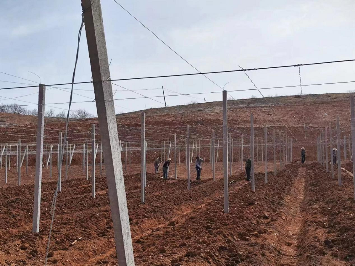 工人們忙著搭架、栽苗3月17日,在曹武鎮(zhèn)白泉村新葡萄種植基地里,工人和村民們打樁立架、捆綁鋼絲、栽種葡萄苗,個(gè)個(gè)忙得不可開(kāi)交?!拔覀?cè)鹊闹鲗?dǎo)產(chǎn)業(yè)是香菇和板栗,近年來(lái),附近的向畈、石板河、曹武等村的葡