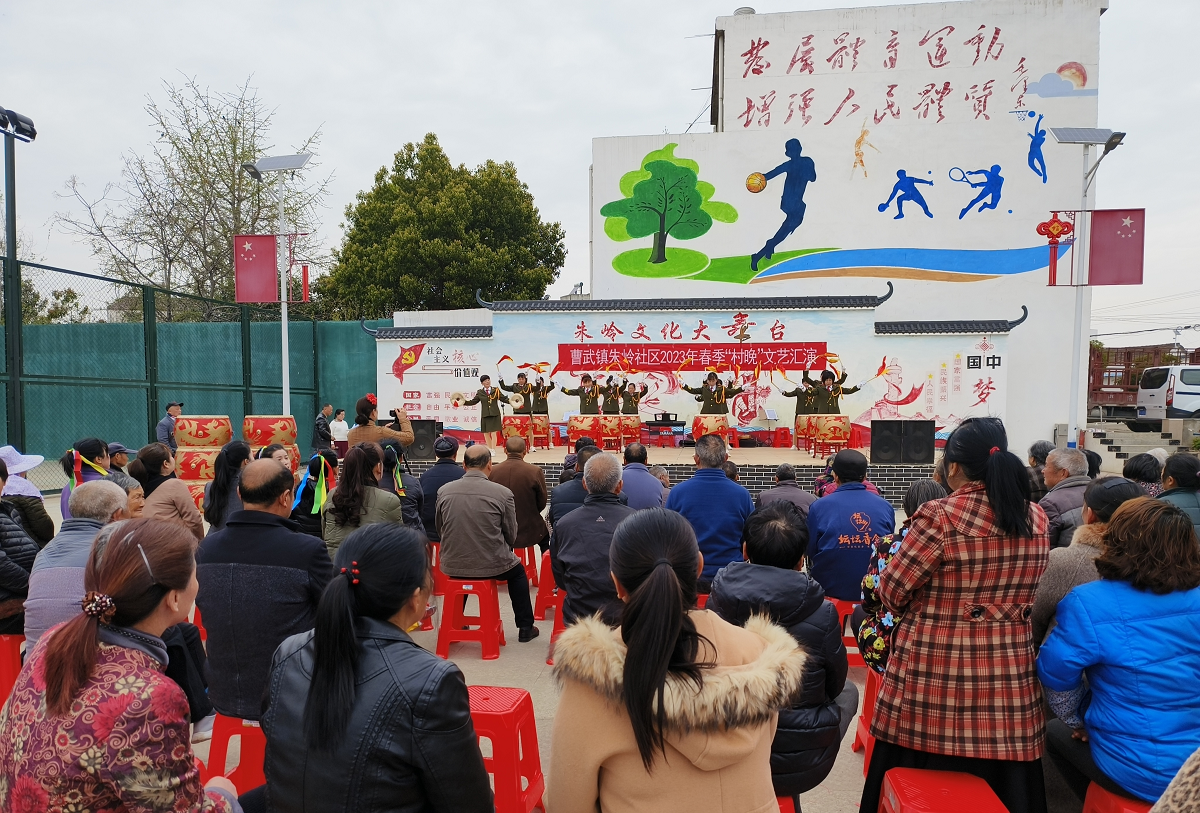 朱嶺社區(qū)居民自排自演的《威風(fēng)鑼鼓》“快到點(diǎn)了老頭子,趕緊拿上板凳走,去晚了就沒(méi)有好位置了……”3月28日,剛過(guò)早飯時(shí)間,曹武鎮(zhèn)朱嶺社區(qū)文化廣場(chǎng)上就聚集起數(shù)百名群眾。舞臺(tái)搭起來(lái)、鑼鼓響起來(lái)、紅歌唱起來(lái)、