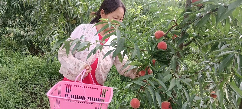 “嘗嘗我家的桃子,絕對讓你吃了還想再來一個?!?月5日,綠林鎮(zhèn)廠河村余老三果園里桃子豐收,果園主人榮美嬌正滿臉喜悅地摘桃子。榮美嬌是在2003年嫁到綠林鎮(zhèn)廠河村的,當時家境不是很好。為了撐起這個家庭,