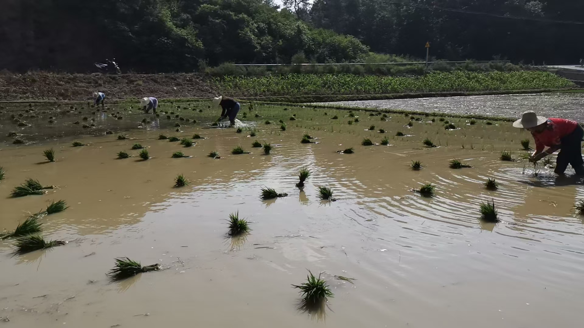 一大早,太陽剛剛升起,山間晨霧未散,稻田里已經(jīng)來了一群人。他們身穿高筒雨鞋,頭戴草帽,將一捆捆秧苗隔一段距離丟到田里。然后左手拿著一把秧苗,右手將秧苗分出,如蜻蜓點(diǎn)水般迅速地把秧苗插進(jìn)泥土里。隨著太陽升高,稻田里一排排嫩綠的秧苗迎風(fēng)搖曳,呈現(xiàn)出一幅生機(jī)勃勃的美景。