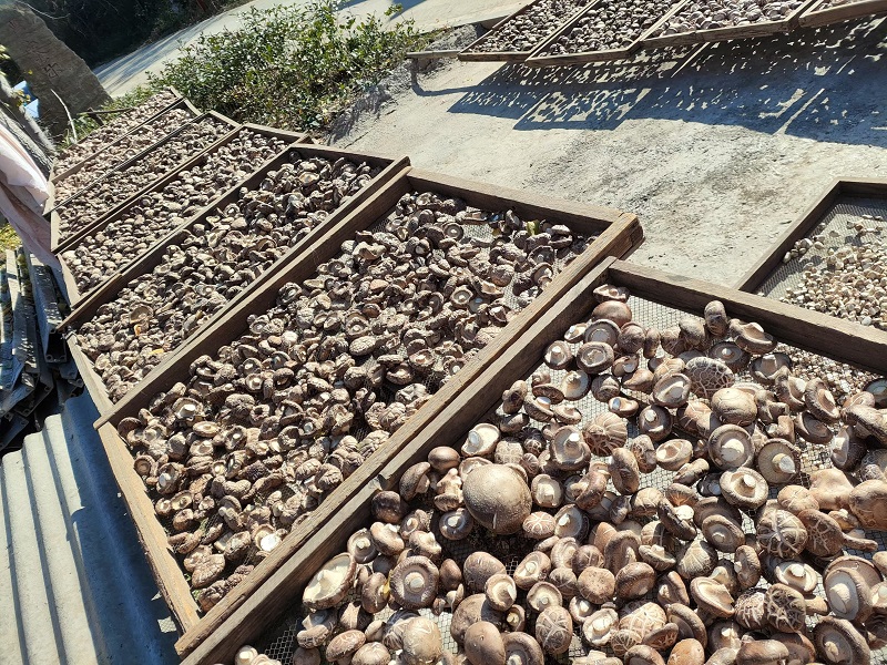 采摘下來(lái)的一部分新鮮香菇運(yùn)送到餐館,一部分經(jīng)過(guò)烘干、晾曬,售賣給收干香菇的商人,經(jīng)過(guò)二次加工作為土特產(chǎn)品銷售出去。