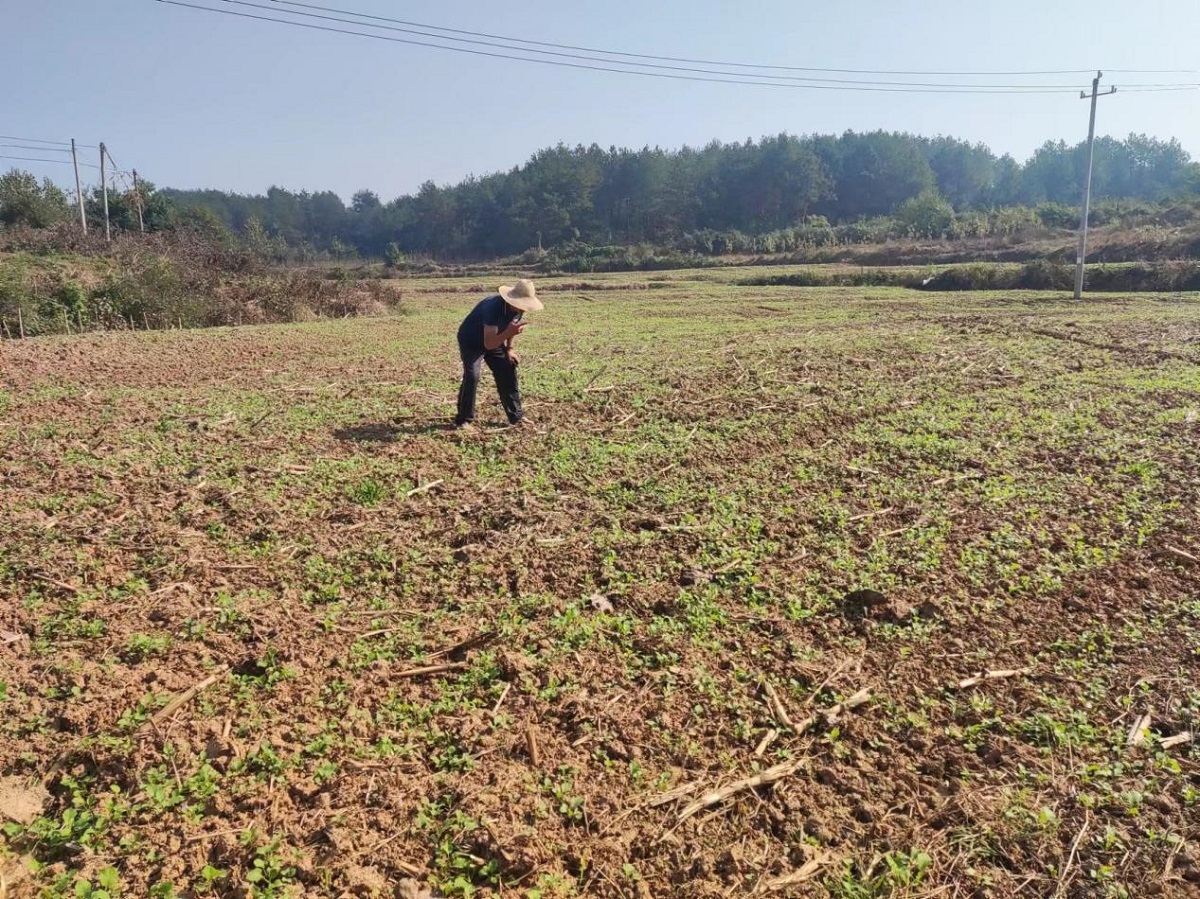 “這地方叫黃土沖。我是國慶節(jié)期間整的地播的種,種了50畝油菜,現(xiàn)在已經(jīng)長到兩葉一心。目前正在搶抓農(nóng)時,加緊整地開溝,計劃再種50畝小麥,爭取秋播面積超百畝。”10月17日,在鮑河村七組黃土沖,該村種田