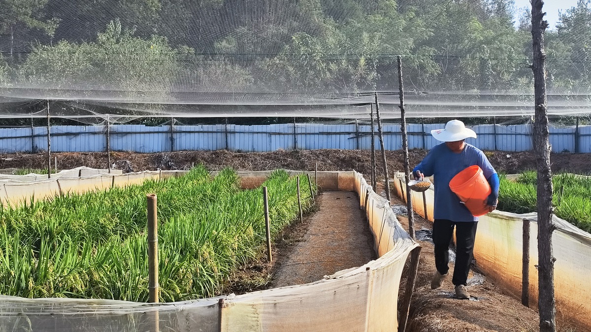“近日天氣熱得很,前段時間開了閘,放了水,我來看看老黃家的稻蛙怎么樣了?!?月23日,宋河鎮(zhèn)龍王村村干部黃敦兵來到村里的特色生態(tài)產(chǎn)業(yè)——稻蛙養(yǎng)殖基地現(xiàn)場察看情況。(黃章文正在喂青蛙飼料)車子在羊腸小道