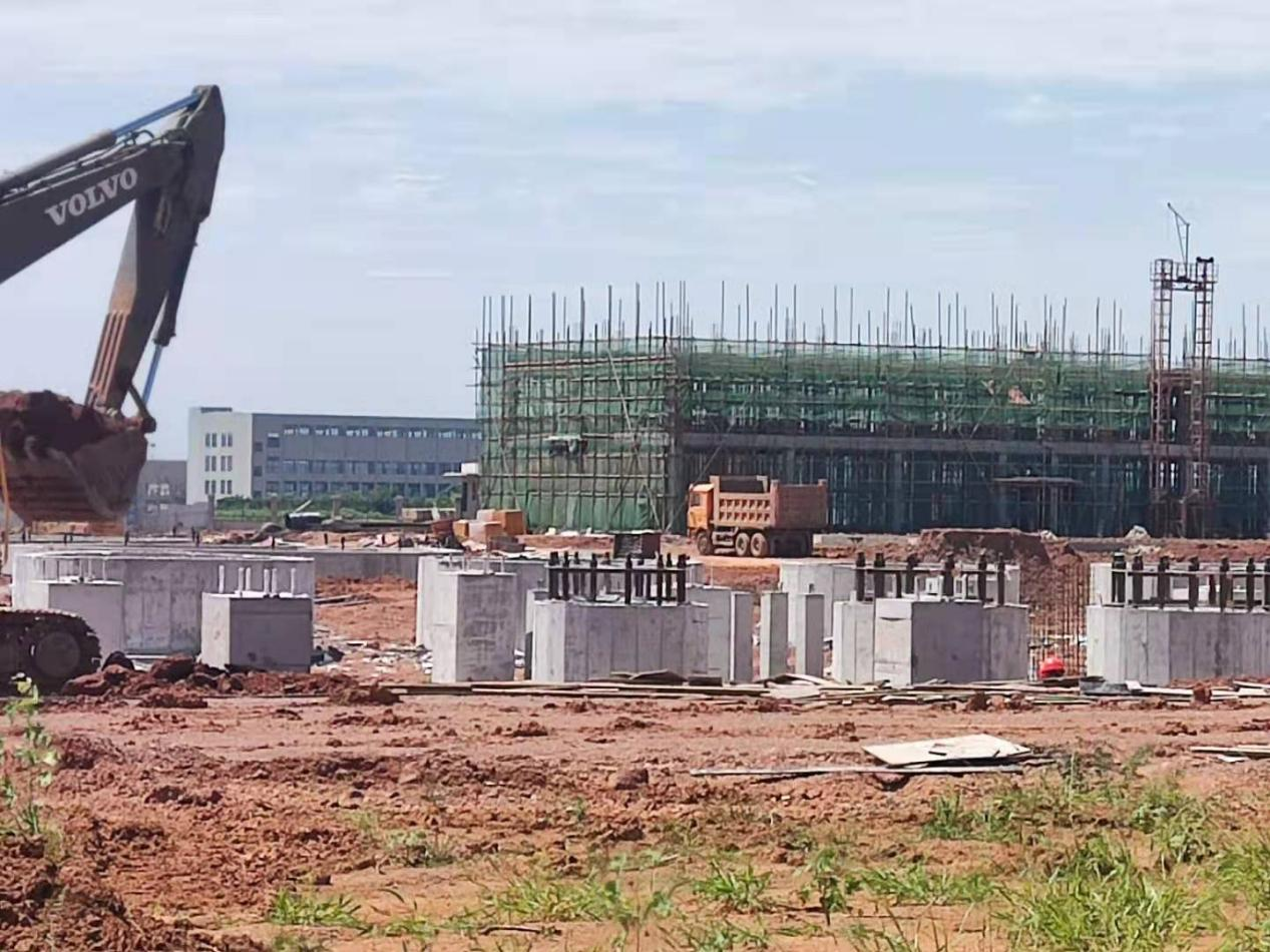 (湖北源源新材料科技有限公司項目建設現(xiàn)場)“原材料產(chǎn)品主罐儲組基本建成,綜合樓主體7月底可以封頂;灌裝站、回收裝置、消防水設施、循環(huán)水池、控制室、維修加工廠房等工程已完成基礎處理;門衛(wèi)室已建好,裝修后
