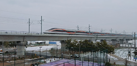 高鐵軌道上,銀白色的列車穿行在銀裝素裹的景致中,車身與雪景交相輝映,仿佛一條鐵龍在畫中游走。