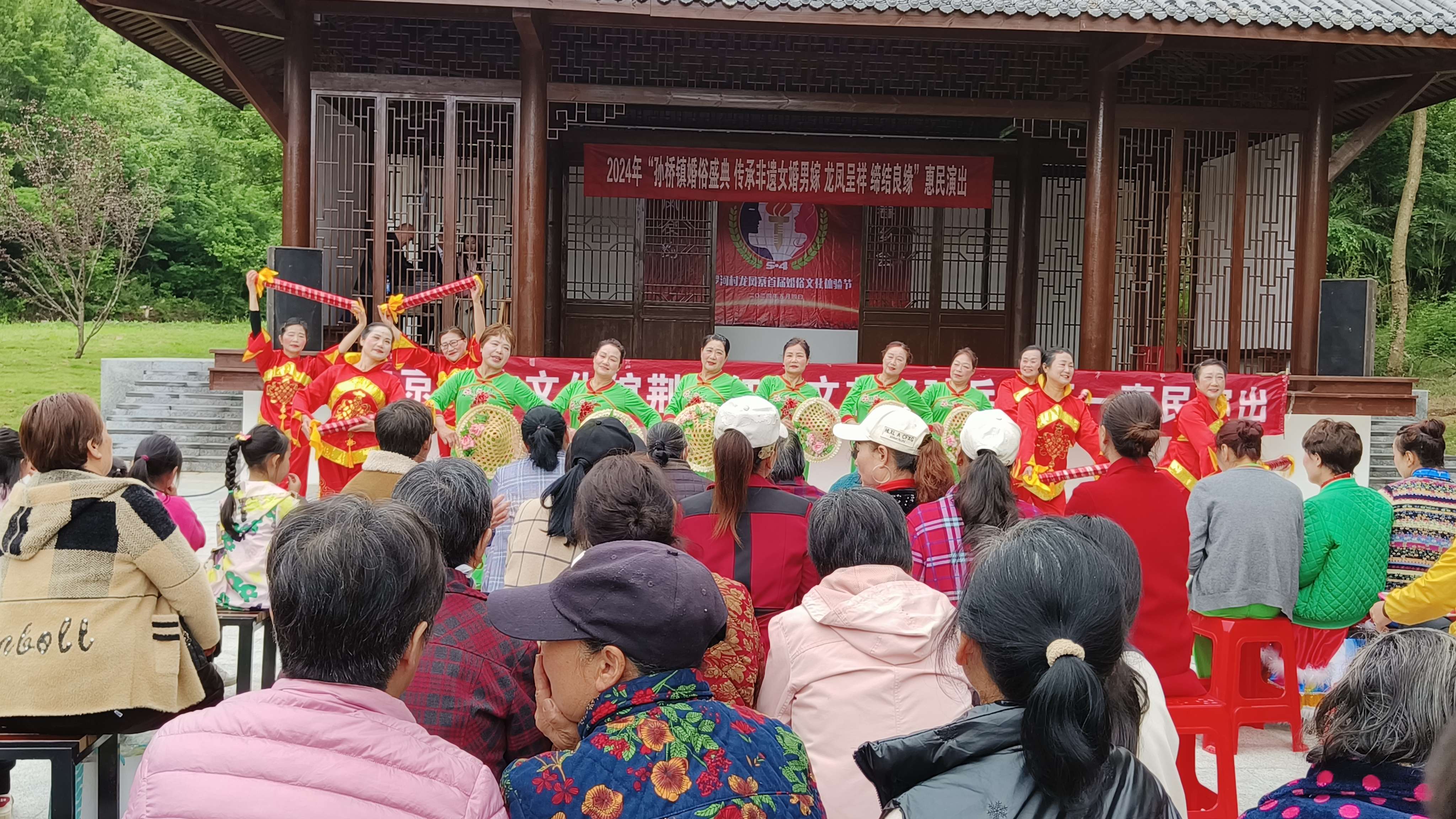 5月4日,孫橋鎮(zhèn)梭羅河村的文化廣場上,開展了一場盛大的歡慶梭羅河村龍鳳寨婚俗盛典暨文藝演出,吸引眾多村民的踴躍參與,還吸引了四方游客共襄盛舉?;顒赢斕?,在歡快的鑼鼓聲中,開場舞蹈《歡聚一堂》點燃了整場