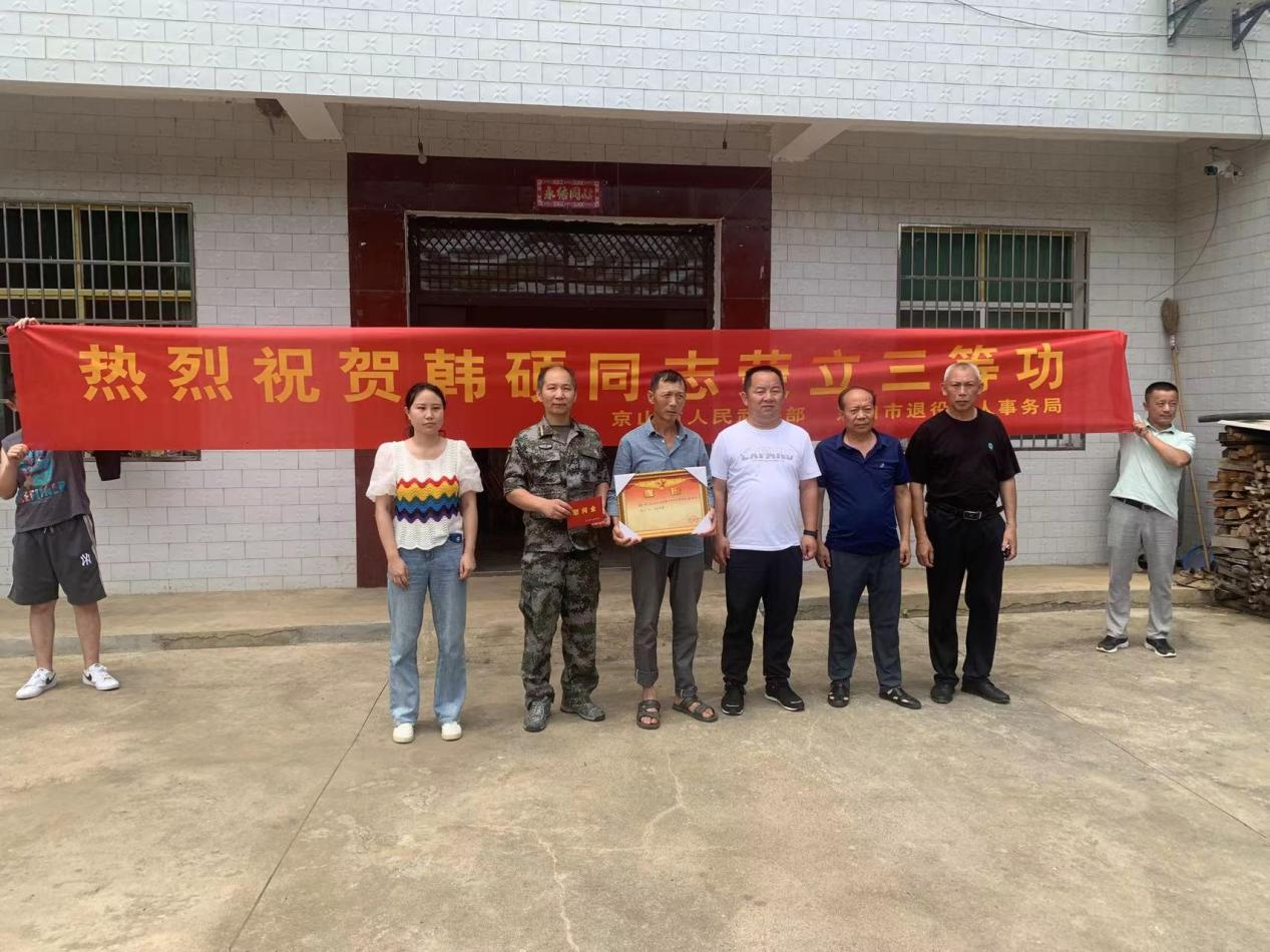 7月26日,伴隨著喧天的鑼鼓,市退役軍人事務局、市武裝部、鎮(zhèn)武裝部、鎮(zhèn)退役軍人服務站共同為榮獲“三等功”榮譽的優(yōu)秀軍官韓碩家屬送上喜報,感謝其軍屬對祖國國防事業(yè)的大力支持。韓碩的父母手捧立功喜報,難掩