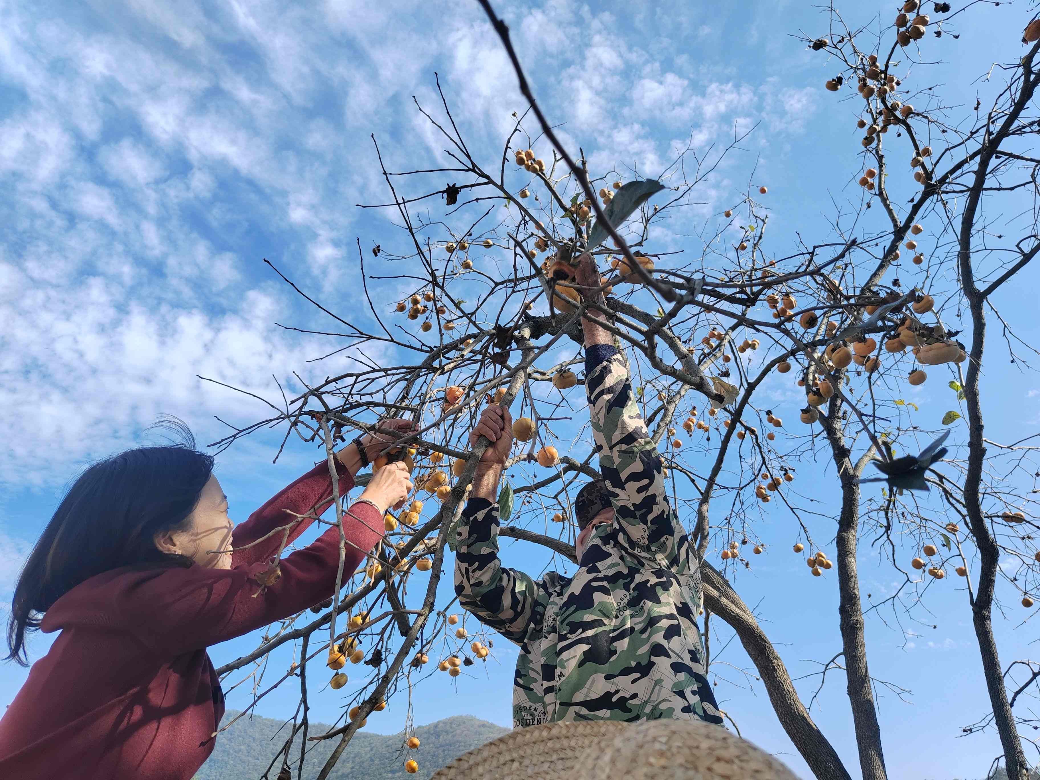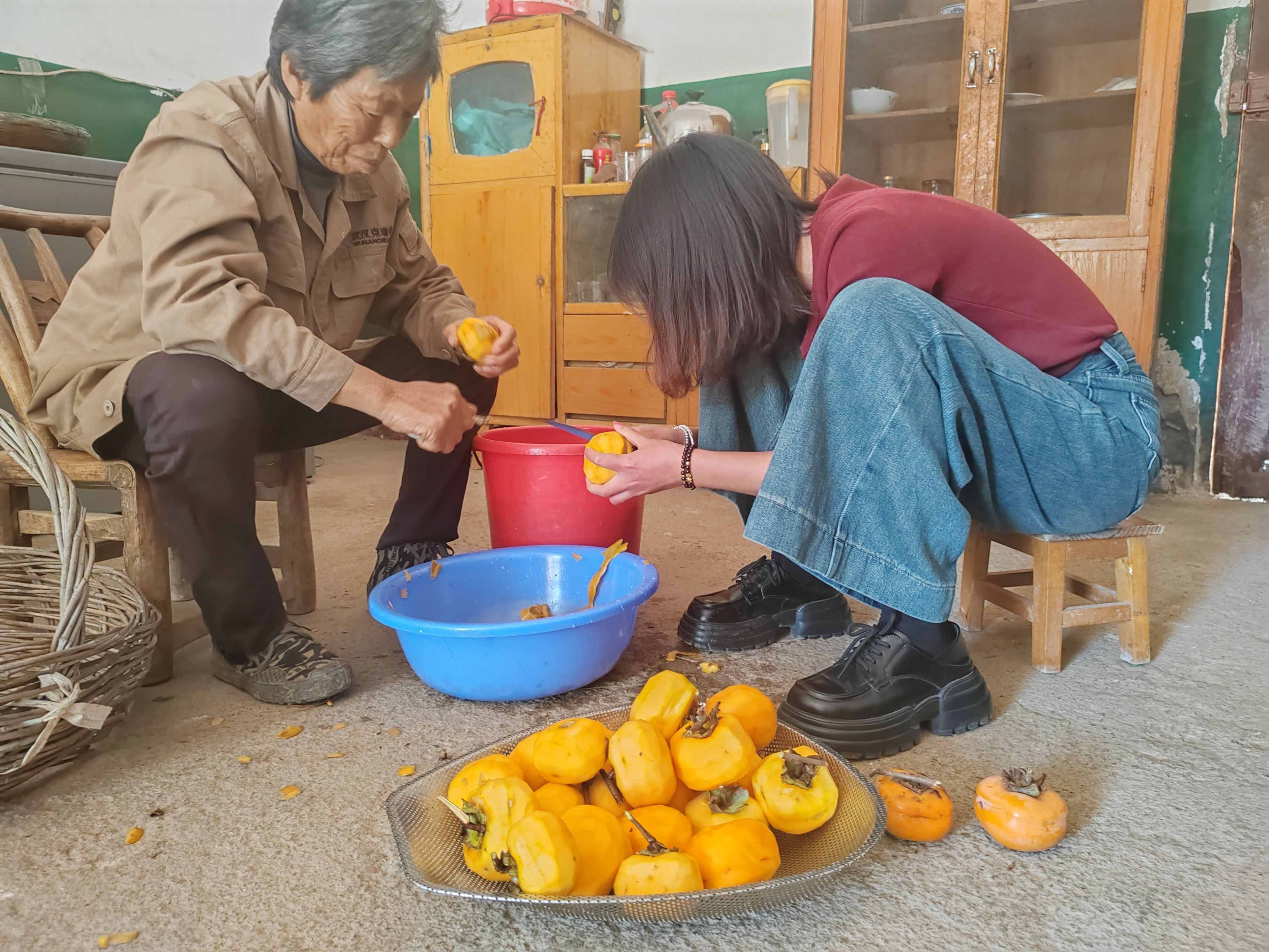 10月25日,秋高氣爽,在新市街道龍泉山村,紅彤彤的滿樹柿子,在藍(lán)天白云的襯托下格外顯眼。柿樹底下,農(nóng)戶家里,龍泉山村后備干部正手把手教村民用傳統(tǒng)手工方式制作柿餅。(易平雁)