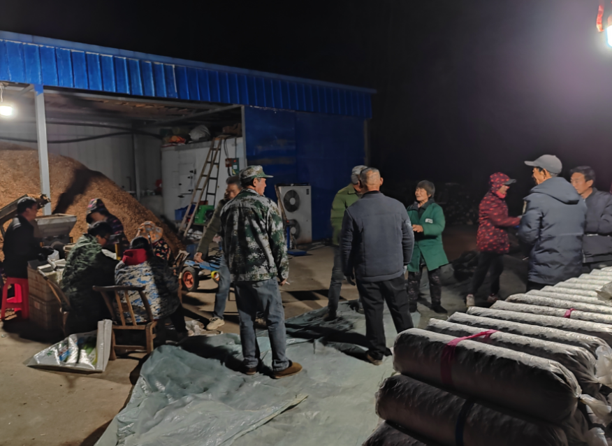 1月8日,在該村一組脫貧戶的門前場(chǎng)地上,燈火通明,制作菌棒的木屑、麩皮等原材料堆積如山,空氣中彌漫著濃郁的菌香。裝袋機(jī)、攪拌機(jī)轟鳴,高速運(yùn)轉(zhuǎn),村民們干勁十足,分工合作,井然有序地進(jìn)行套袋、扎口、上架等工序。