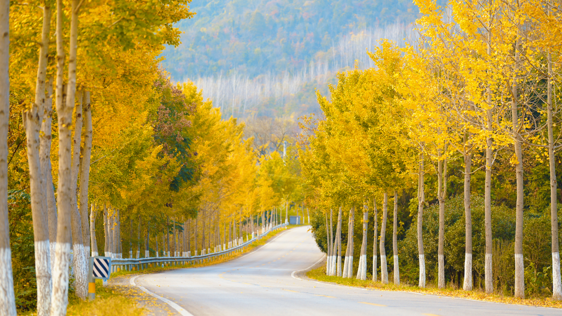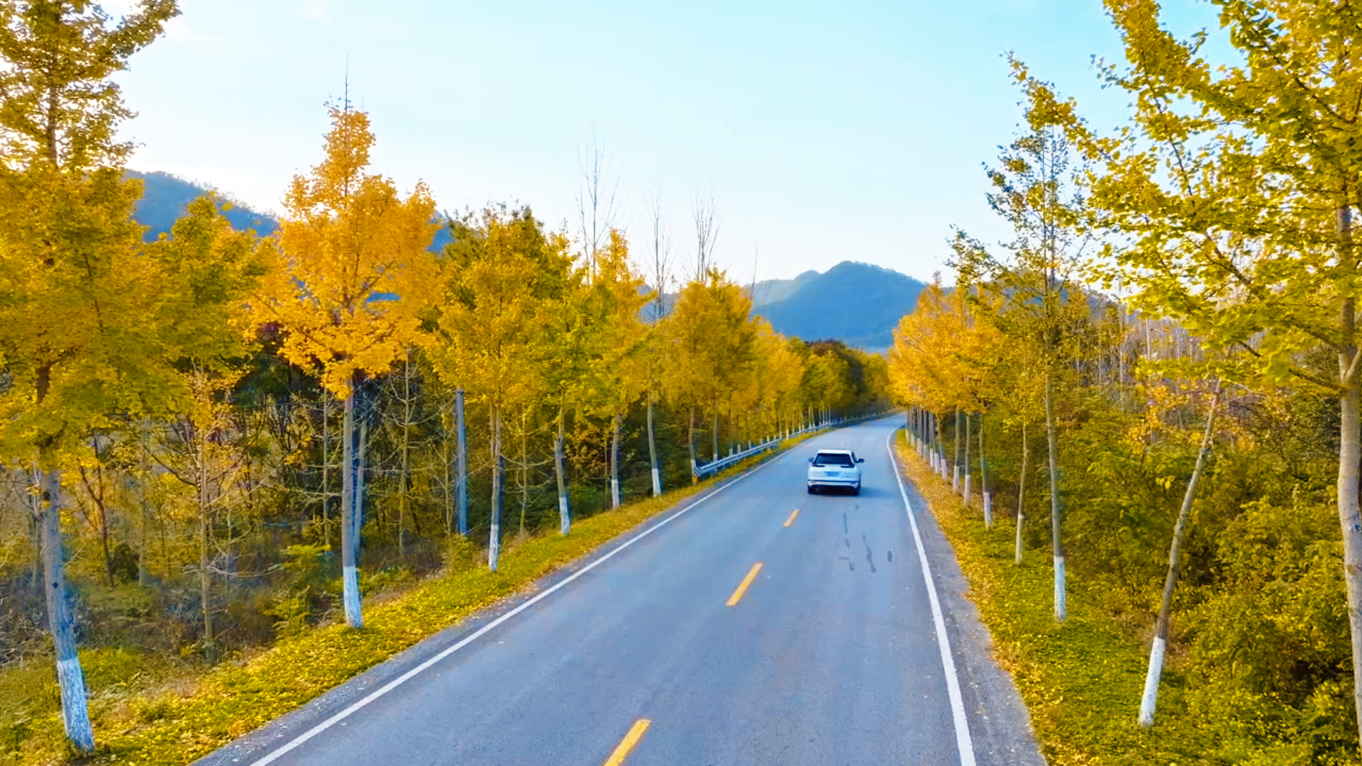 陽光穿透枝椏,在柏油路上織出細(xì)碎光斑,車輛駛過帶起葉聲沙沙,遠(yuǎn)處山巒籠著淡藍(lán)霧靄,襯得滿樹金黃更暖。樹干裹著淺白漆痕,與滿地落金相映,連風(fēng)里都浸著草木的清潤。