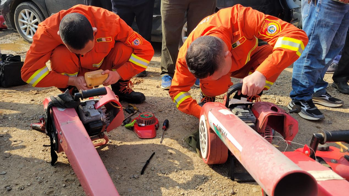 消防隊員檢修風力滅火機“這臺機器的油閥有些問題,我?guī)湍匦聯(lián)Q個零件就能用了?!薄伴L時間不使用時要及時將機器內油罐清空,可以延長機器的使用壽命?!苯?,在楊集鎮(zhèn)雙坪村陳家門灣里,市森林消防隊員們正一邊檢