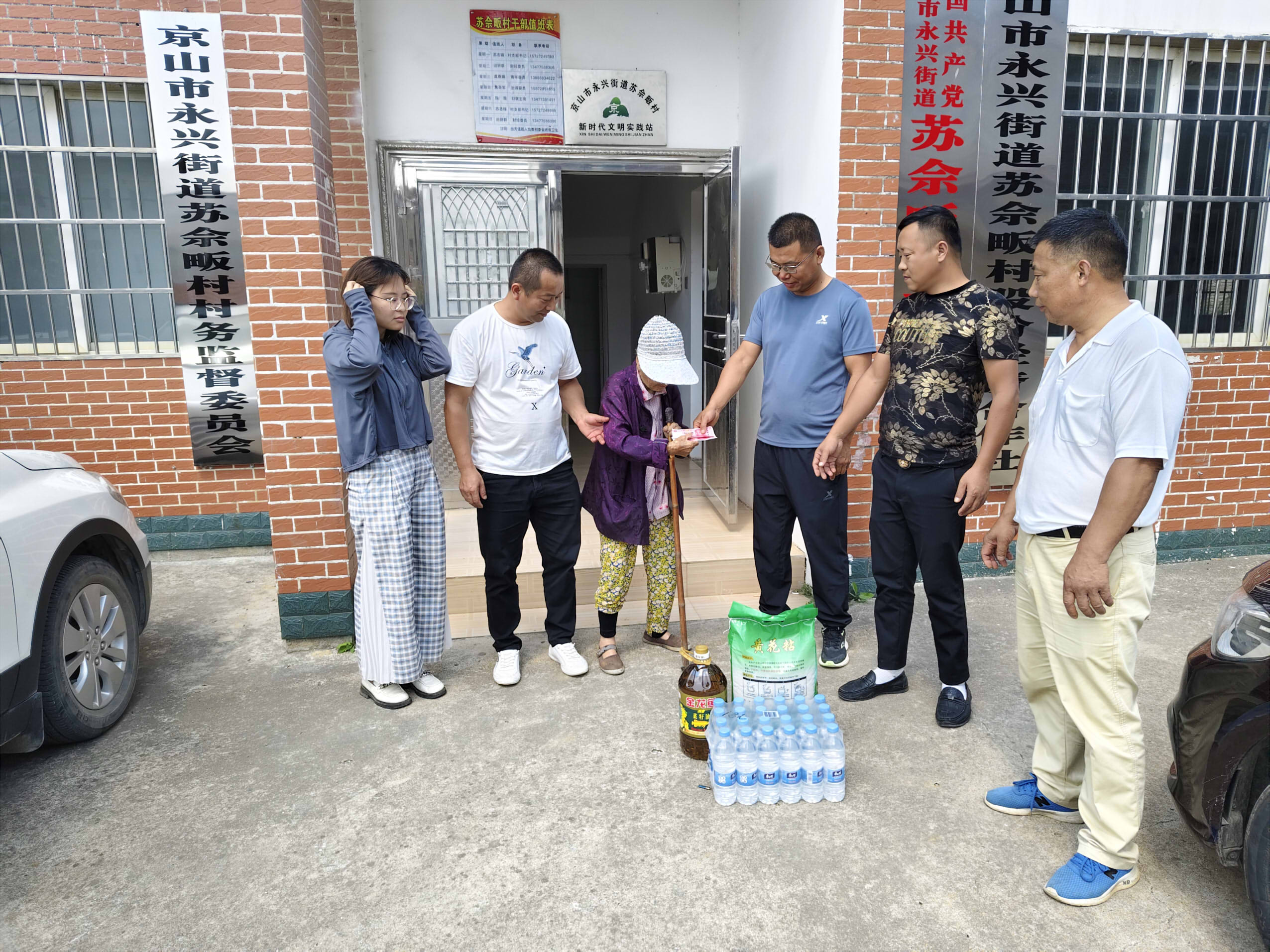 6月6日,永興街道蘇佘畈村村民留守老人楊兆英在村委會(huì)門口收到了一份特殊的“端午節(jié)禮物”,該街道轄區(qū)企業(yè)崢嶸農(nóng)業(yè)合作社負(fù)責(zé)人劉若崢為其捐贈(zèng)了生活物資,送去了溫暖與關(guān)愛?!艾F(xiàn)在天氣炎熱,您在家要注意用火用