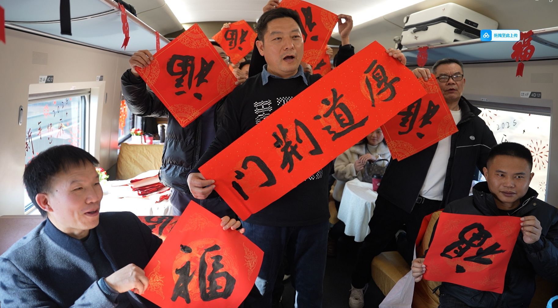 專列旅途中,乘務(wù)人員精心布置車廂,車窗貼上喜慶的窗花,荊門(mén)市人社部門(mén)在列車上組織開(kāi)展了列車春晚、寫(xiě)春聯(lián)送祝福等活動(dòng),車廂內(nèi)洋溢著濃濃的年味。
