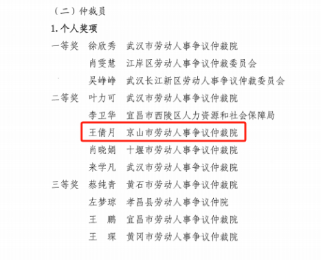 近日,湖北省總工會發(fā)文表彰2025年“湖北工匠杯”技能大賽--全省職工職業(yè)技能大賽個人及團隊獎項,京山市勞動人事爭議仲裁院王倩月榮獲全省首屆勞動人事爭議調解員和仲裁員職業(yè)技能大賽仲裁員賽項個人二等獎。