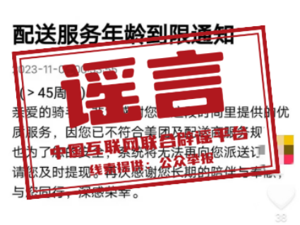 ??真相:近日,一張“配送服務(wù)年齡到限通知”的截圖在網(wǎng)絡(luò)流傳,稱“年齡超過45歲后,就不再符合某外賣平臺(tái)及配送服務(wù)商的服務(wù)規(guī)范,系統(tǒng)將不再派送訂單”。經(jīng)向該外賣平臺(tái)核實(shí),此信息為謠言。該平臺(tái)工作人員在接受記者采訪時(shí)稱,考慮到配送過程中相關(guān)安全因素,會(huì)對(duì)騎手的年齡限制在18周歲至57周歲之間,在此年齡范圍內(nèi),且具有完全民事行為能力和相應(yīng)的獨(dú)立勞動(dòng)能力,身體健康、持有有效健康證且無相關(guān)類型疾病,符合無違法犯罪記錄、熟練駕駛相關(guān)車輛等要求的人員均可注冊(cè)為網(wǎng)約配送員,網(wǎng)傳“配送員年齡上限為45歲”系虛假信息。(來源:北京網(wǎng)絡(luò)辟謠、上海網(wǎng)絡(luò)辟謠、湖北網(wǎng)絡(luò)辟謠)