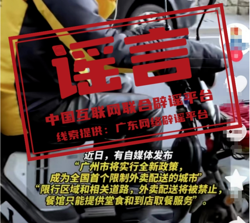 | 2023年12月25日 謠 言 廣州市將限制外賣配送?真相:近日,有自媒體發(fā)布“廣州市將實行全新政策,成為全國首個限制外賣配送的城市”“限行區(qū)域和相關(guān)道路,外賣配送將被禁止,餐館只能提供堂食和到店取 |