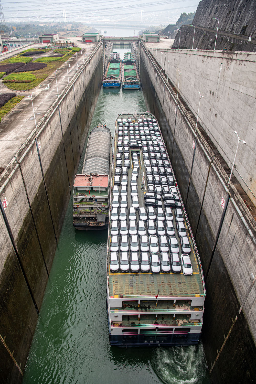 來到三峽雙線五級船閘,一艘滿載著產(chǎn)自重慶的新能源汽車的船舶正在過閘。船閘上下落差高達113米,相當于約40層樓的高度,是目前世界上連續(xù)級數(shù)最多、總水頭和級間輸水水頭最高、技術(shù)最復(fù)雜的內(nèi)河船閘。船舶過閘,如同爬上一階階巨大的樓梯。