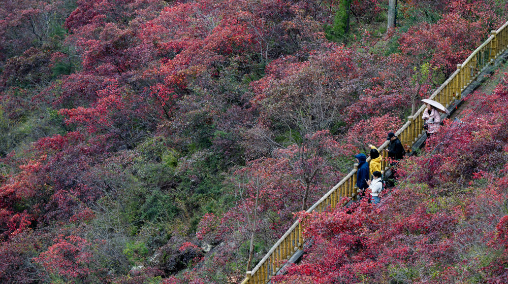 驅(qū)車行至巫山縣巫峽長江大橋,眺望峽口的文峰景區(qū),只見成團成簇的紅葉,扎根在如刀削斧砍般的峭壁上,迎風(fēng)挺立,從江面一直“披掛”到峰頂。來自天南海北的游客,被這大美景象吸引,不懼山路險峻,攀行在紅葉掩映的步道上,時而駐足留影,時而驚嘆連連。