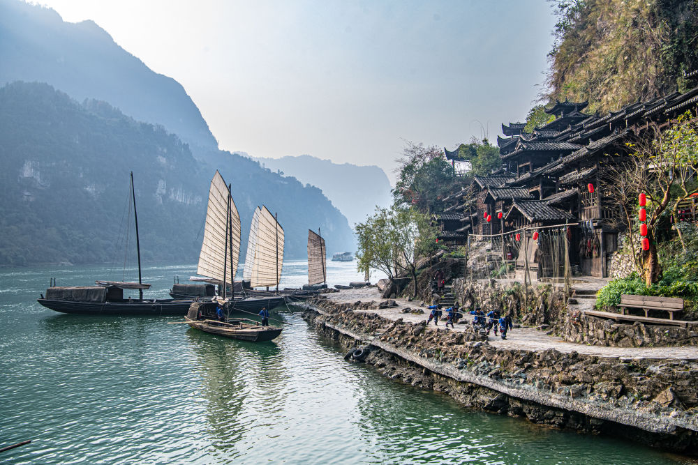 在西陵峽境內(nèi)的“三峽人家”龍津溪景區(qū),吊腳樓點綴于山水間,帆船停泊在溪口處,“纖夫”們喊著古老的峽江號子,靈動的小橋流水,獨具韻味的民俗風(fēng)情,令一路“扁舟下三峽”的游人們流連忘返。
