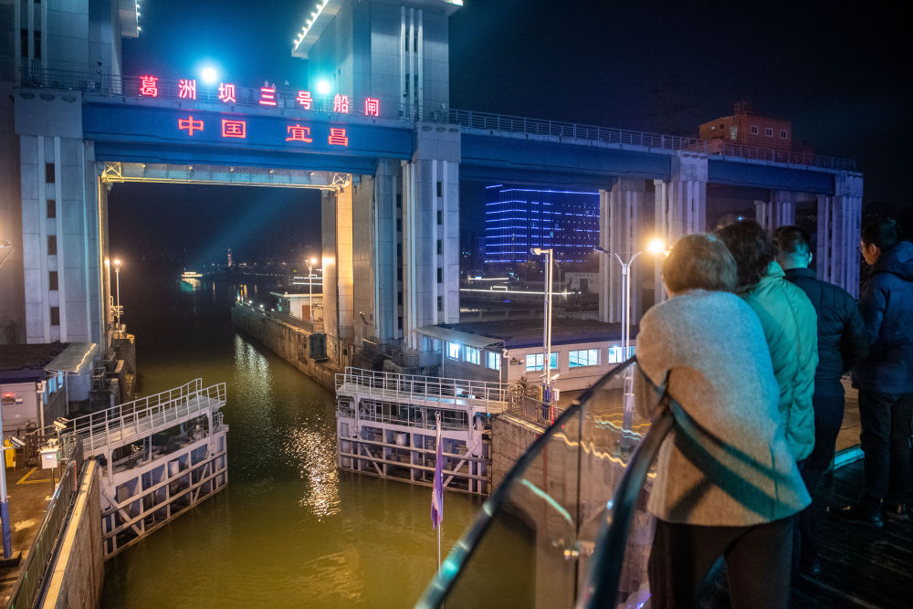 游客乘坐純電游輪“長江三峽1”號通過葛洲壩三號船閘(2023年12月1日攝)。新華每日電訊記者 唐奕 攝