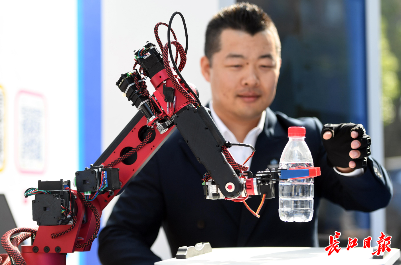 灝存科技CEO熊鵬航戴著人工智能數(shù)據(jù)手套進(jìn)行人形機(jī)器人動作訓(xùn)練。長江日報記者高勇攝