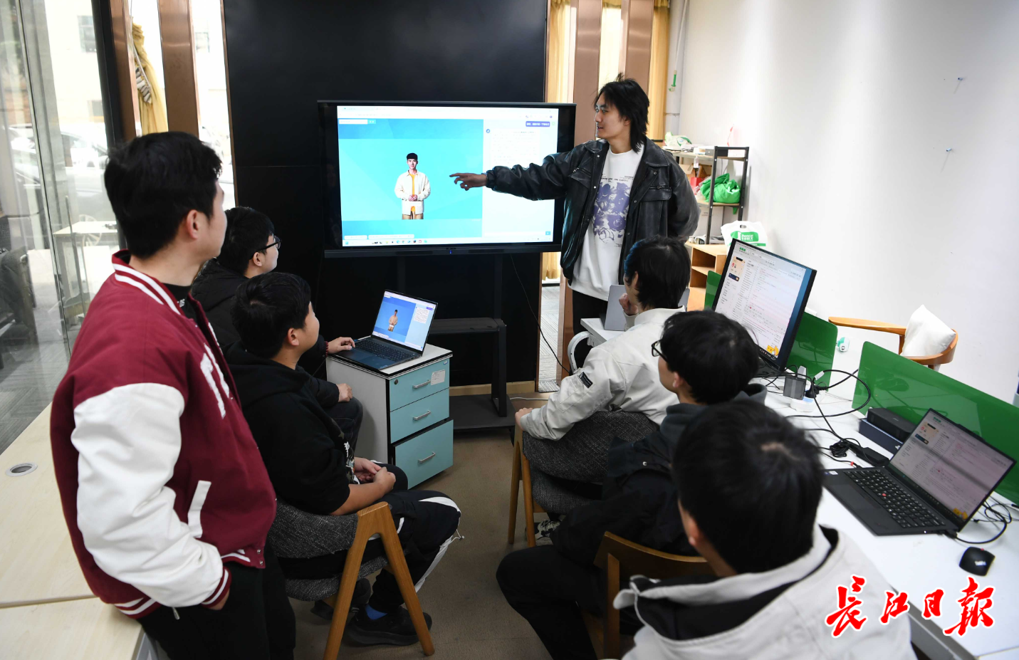 模態(tài)躍遷科技首席運營官常元和(前站立者)與設(shè)計人員討論Al數(shù)字人設(shè)計。長江日報記者高勇攝
