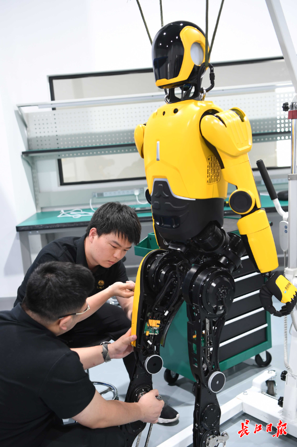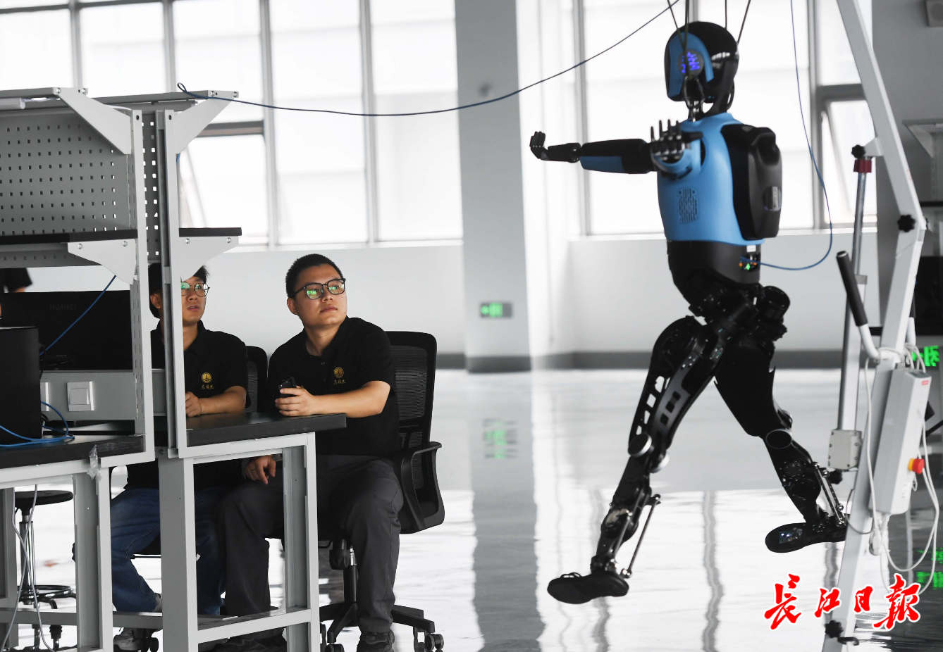 在光谷東智人形機(jī)器人生產(chǎn)車間,研發(fā)人員正在調(diào)試優(yōu)化人形機(jī)器人。長江日報記者高勇 攝