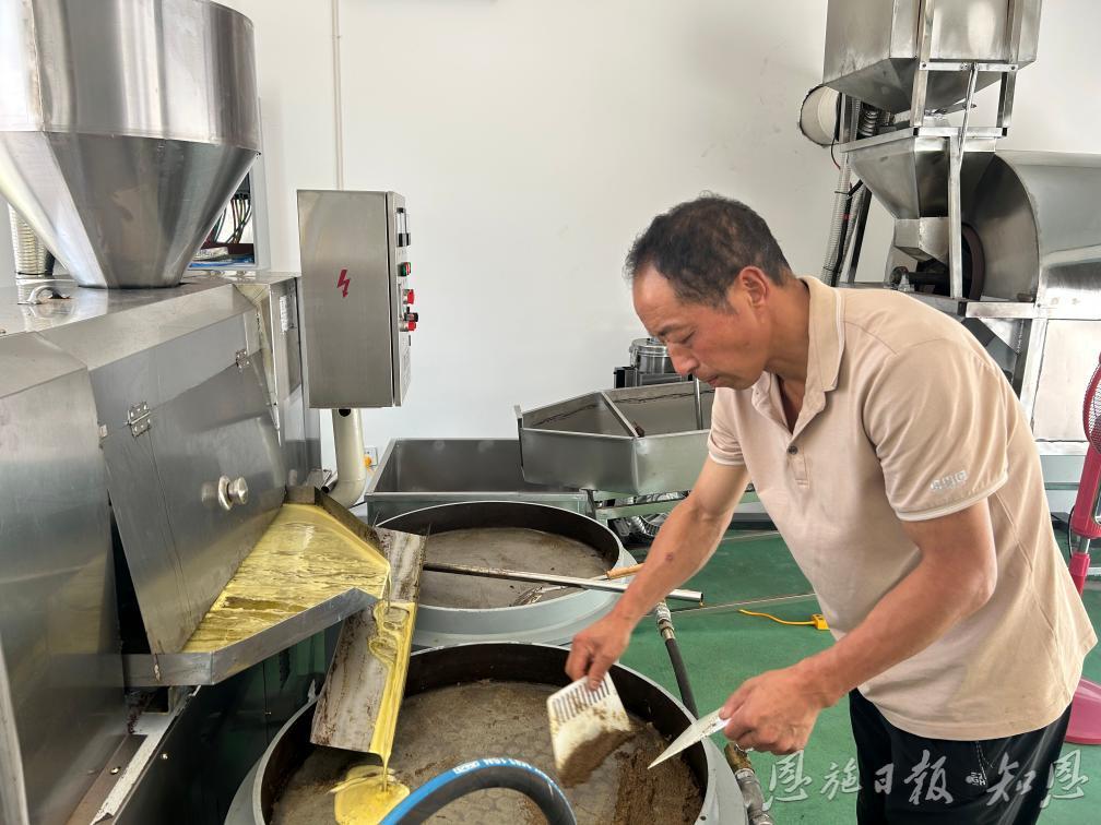 2025年6月16日,容華食品工人周元吉在半自動生產(chǎn)線上,為村民加工菜籽油。