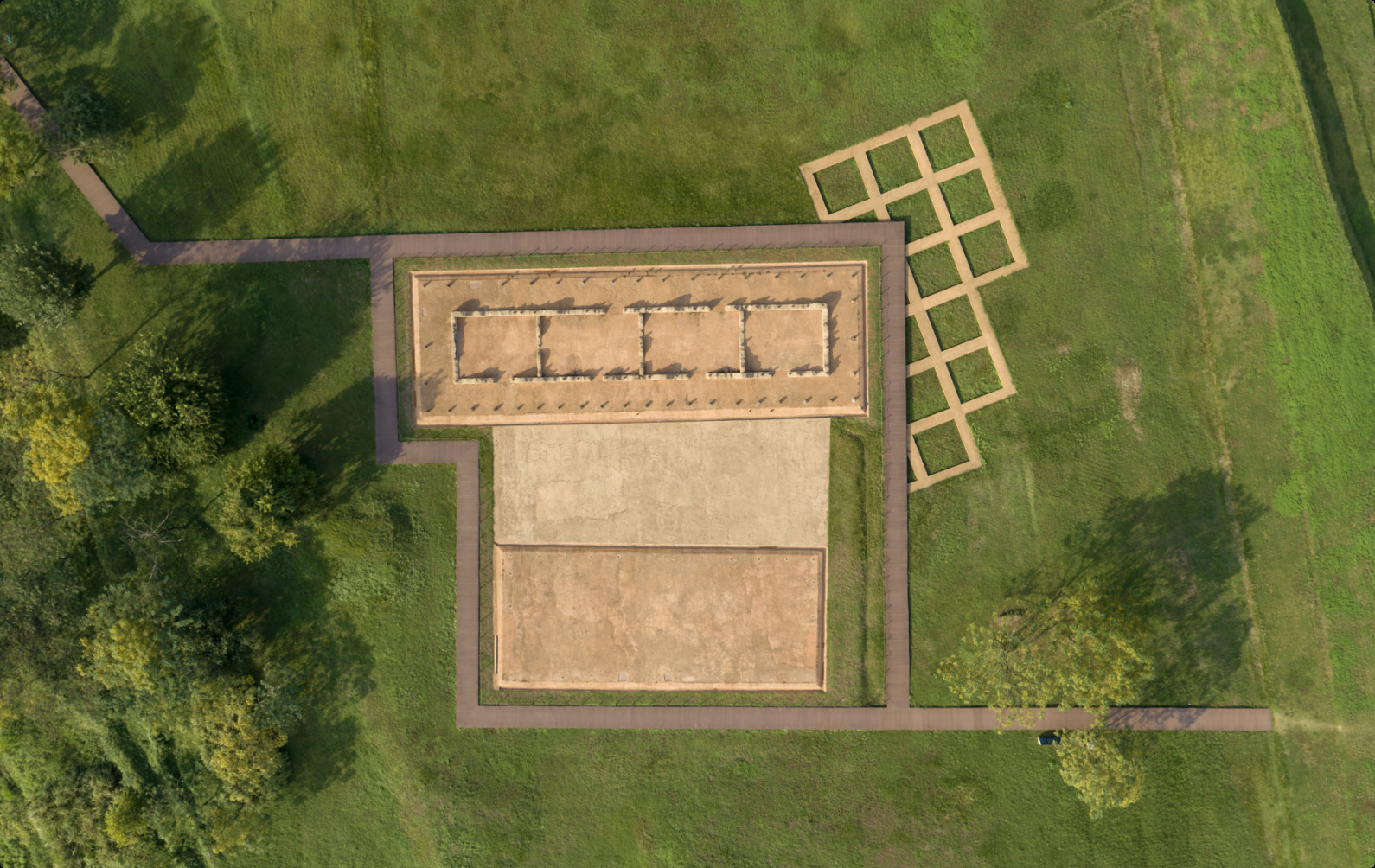 走在遺址公園,許多人的感覺(jué)是“有點(diǎn)空”。這里沒(méi)有一切熱門(mén)裝飾,唯一大型地面建筑是博物院。遠(yuǎn)遠(yuǎn)看去,博物院沙丘色的新建筑仿佛與地面起伏的草坪長(zhǎng)在了一起,這是“半嵌入式”設(shè)計(jì)。沿階而上,到一觀景天臺(tái),能遠(yuǎn)眺整個(gè)遺址區(qū)的湖光水色?!拔覀?cè)诮ㄔ簳r(shí)就考慮,把遺址整體作為一件藏品來(lái)展示?!北P(pán)龍城遺址博物院原院長(zhǎng)萬(wàn)琳說(shuō)。