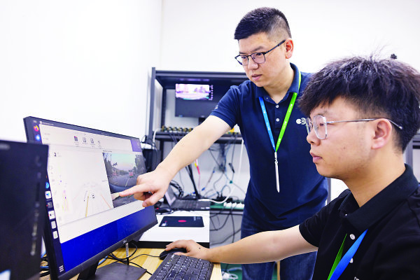 黑芝麻智能應(yīng)用工程部陶星(左)團(tuán)隊(duì)在測(cè)試A1000芯片適配軟件。長(zhǎng)江日?qǐng)?bào)記者胡冬冬 攝