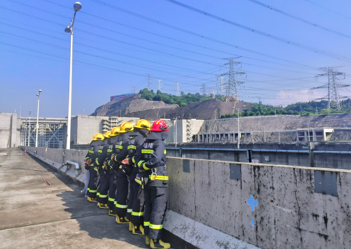 五級(jí)船閘的第4級(jí)閘室里,4艘南線下行的?;反罢诘群蜻^(guò)閘。船閘一側(cè)平臺(tái)上,宜昌市消防救援支隊(duì)三峽壩區(qū)特勤大隊(duì)特勤二站的6名消防指戰(zhàn)員穿著厚重的滅火防護(hù)服,筆直地站在平臺(tái)上執(zhí)行護(hù)航勤務(wù)。每名消防戰(zhàn)士臉上,不斷滾落大顆的汗珠。
