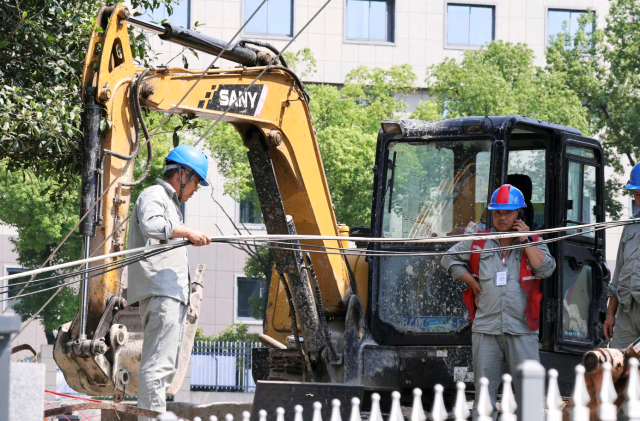 7月7日上午10時(shí)許,宜昌城區(qū)氣溫38℃,體育場(chǎng)路兩網(wǎng)改造施工現(xiàn)場(chǎng),施工人員戰(zhàn)高溫,堅(jiān)守崗位。記者吳延陵 攝