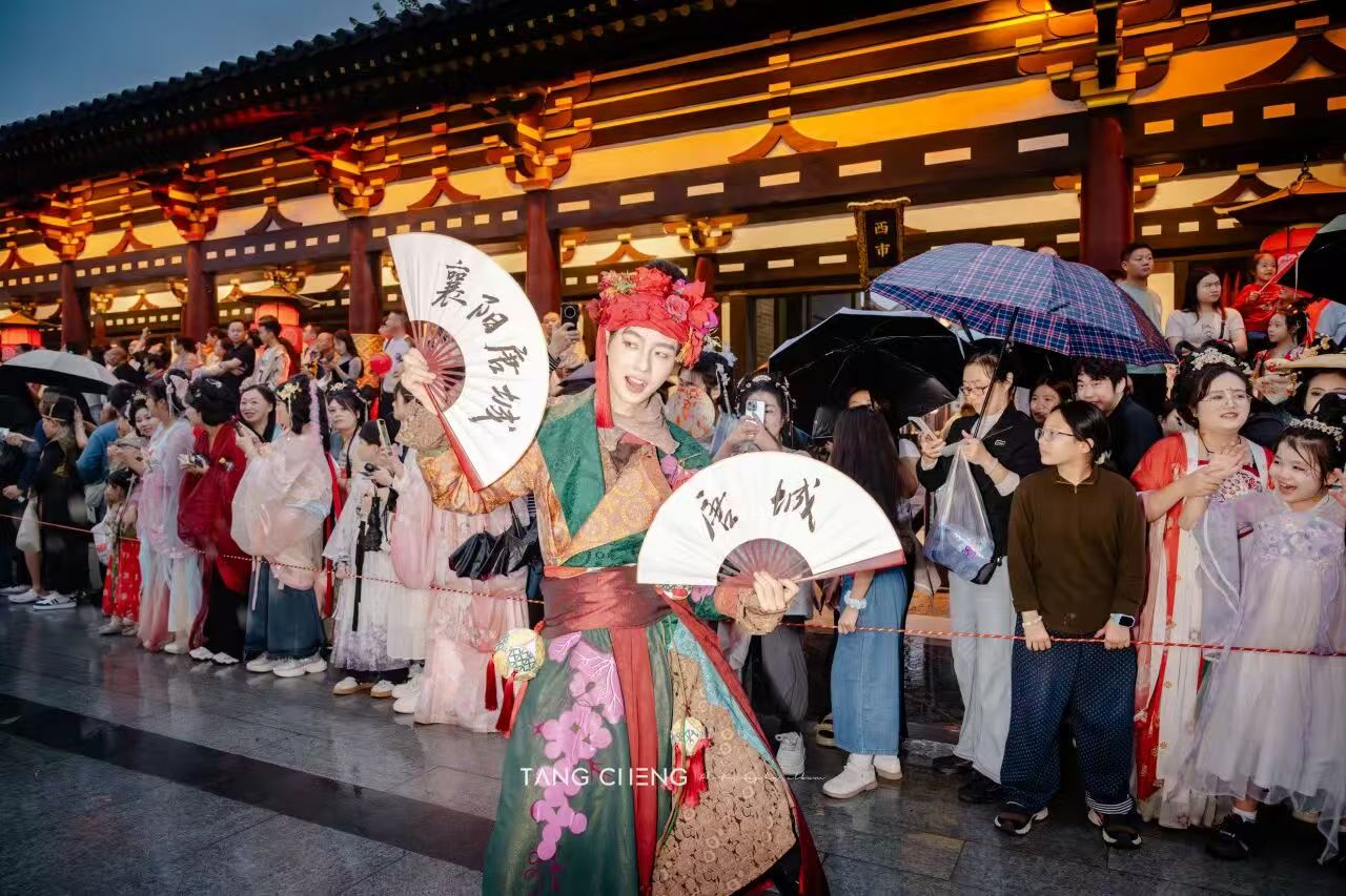 文旅企業(yè)的積極參與,讓這場盛會的體驗(yàn)維度更加豐富。襄陽旅游年票現(xiàn)場銷售,襄陽華僑城奇幻度假區(qū)工作人員向過往游客推介當(dāng)季主打文旅產(chǎn)品——云海湯泉。堯治河旅游度假區(qū)的大廚參與廚藝比拼,為游客現(xiàn)場烹飪拿手菜。唐城不僅帶來了新潮有趣的文創(chuàng)產(chǎn)品,景區(qū)行走的IP“唐城將軍”更是與一眾NPC人物巡游,與游客互動。